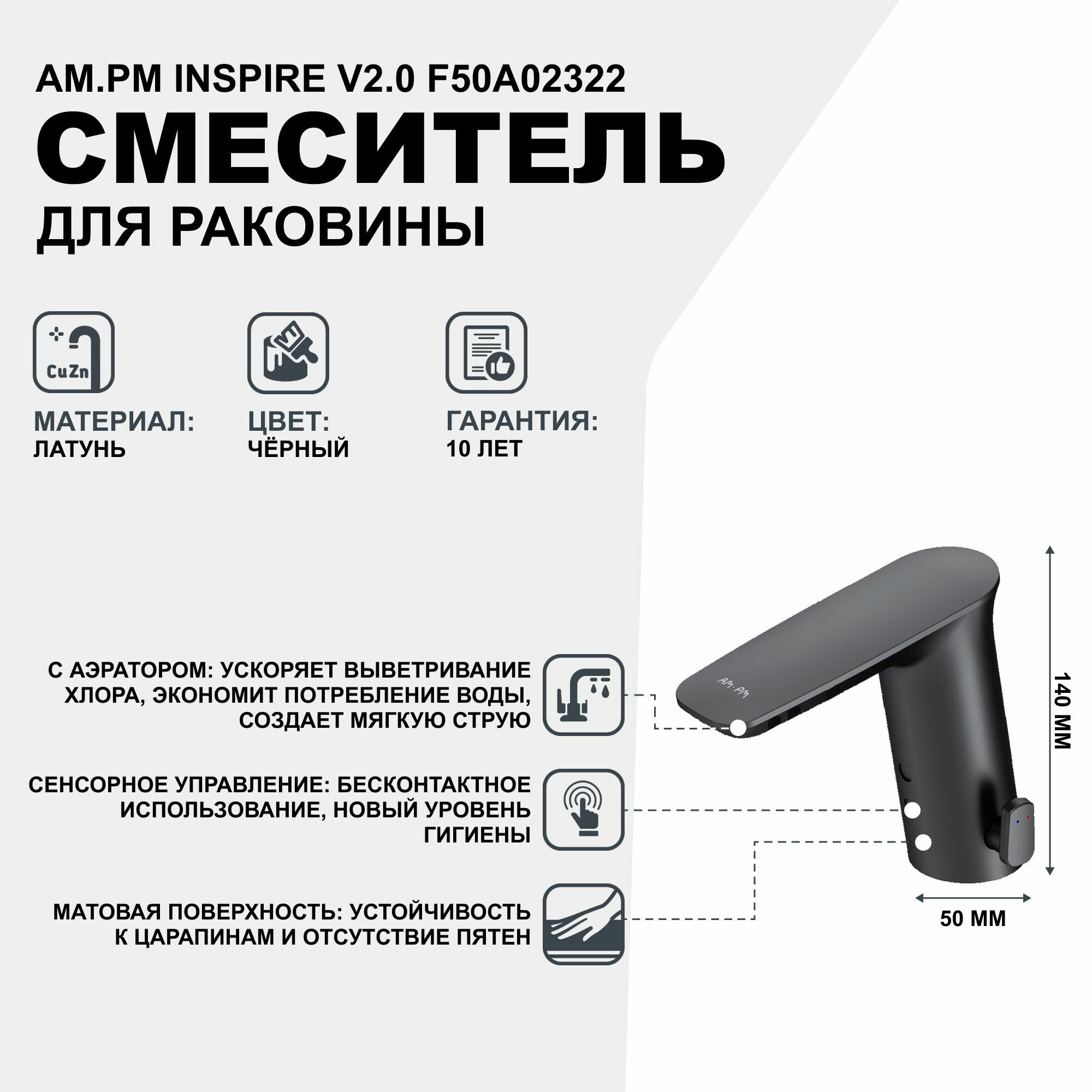 Am.Pm F50A02322 Inspire V2.0 смеситель для умывальника сенсорный, черный, шт.