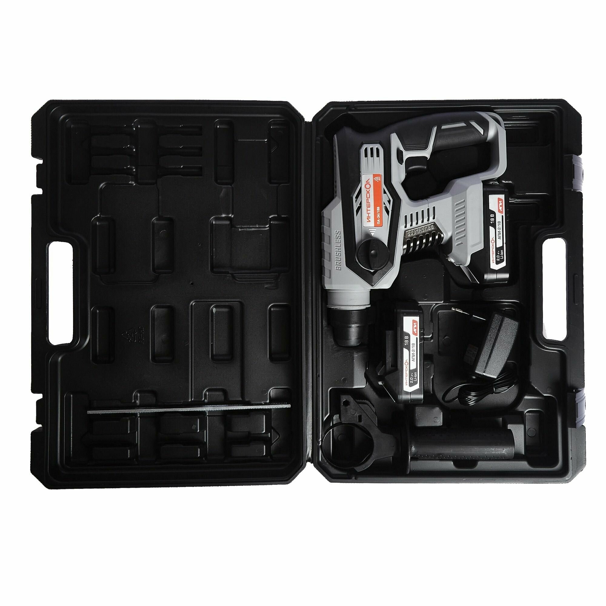 | Комплектация | Аккумуляторный перфоратор 2 аккумулятора Часовое моноблочное зарядное устройство Дополнительная рукоятка Металлический ограничитель глубины бурения Руководство по эксплуатации и инструкция по безопасности Гарантийный талон Пластмассовый кейс |