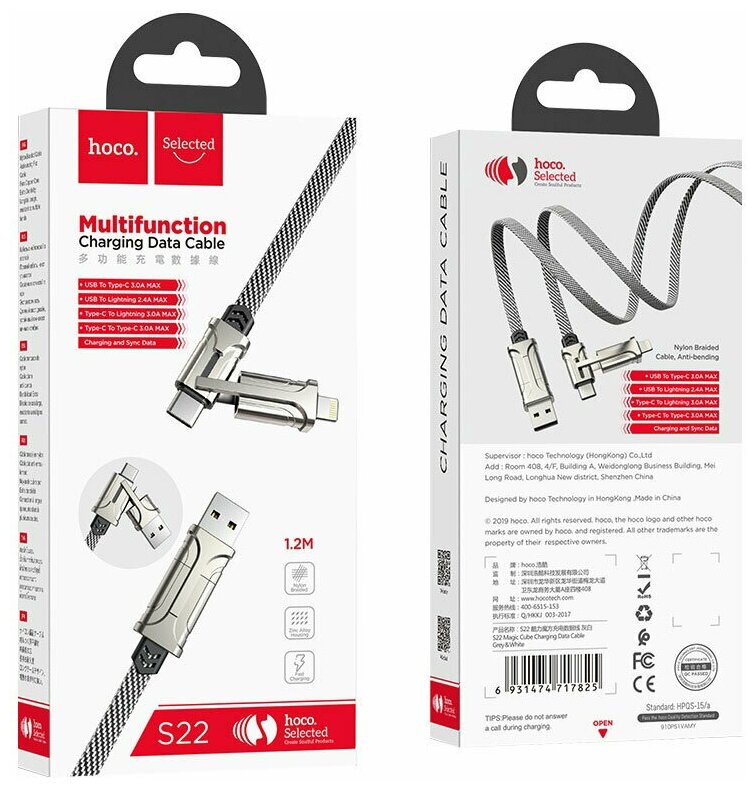 Купить Кабель USB, Type-C - Apple 8 pin, Type-C HOCO S22 Magic Cube, 1.2 м, плоский, ткань, 4 в 1, белый, серый