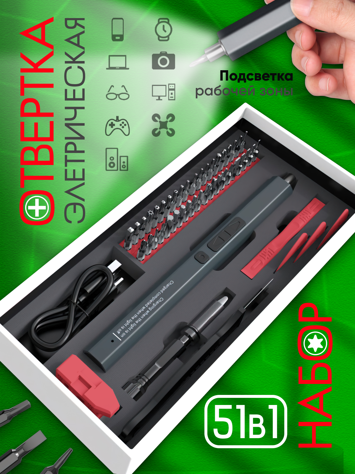 Отвертка аккумуляторная электрическая 51в1, с фонариком, серая