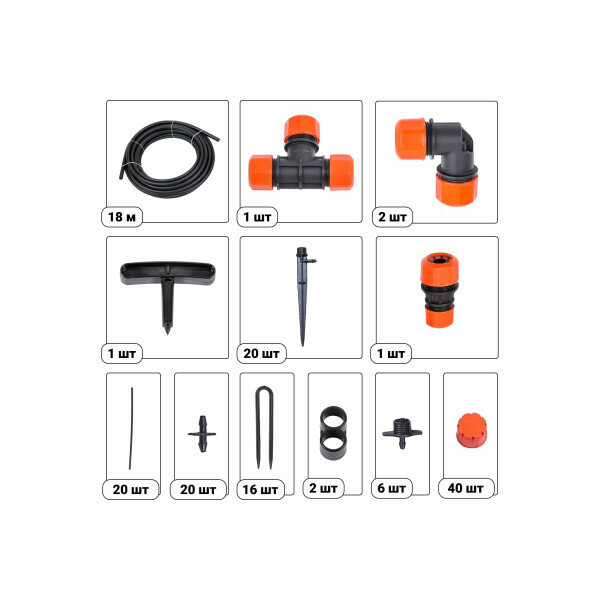 | Комплектация | Шланг магистральный 1/2" - 1 шт; Микротрубка - 10 шт; Муфта 1/2" - 3/4" - 1 шт; Цанговый тройник 1/2" - 1 шт; Цанговый уголок 1/2" - 2 шт; Микродождеватель - 10 шт; Микродождеватель с ножкой - 10 шт; Зажим для магистрального шланга - 2 шт; Прижим для магистрального шланга - 8 шт; Шило для магистрального шланга - 1 шт. |