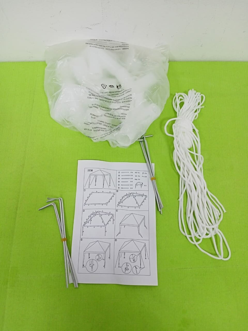 | Минусы: | Заявлено 3х3м., на самом деле 2,87х2,87м. Ткань тончайшая, плывёт, сшито криво, сквозь крышу чётко видно облака и пролетающих птиц. Каркас жидкий, слабый, металл трубок почти фольга. |