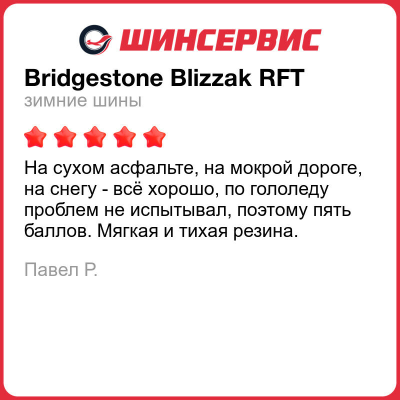 | Отзыв: | Купил RFT на машину жены, потому что прошлой зимой ездил с ней на сервис постоянно. То одну шину латать, то другую - устал, вот честно. По отзывам в интернете выбрал эти, о них писали немного, но хорошее. Ну и плюс японский бренд, все дела)) Пока что полет нормальный, в сервис после монтажа не ездили, посмотрим как дальше. |