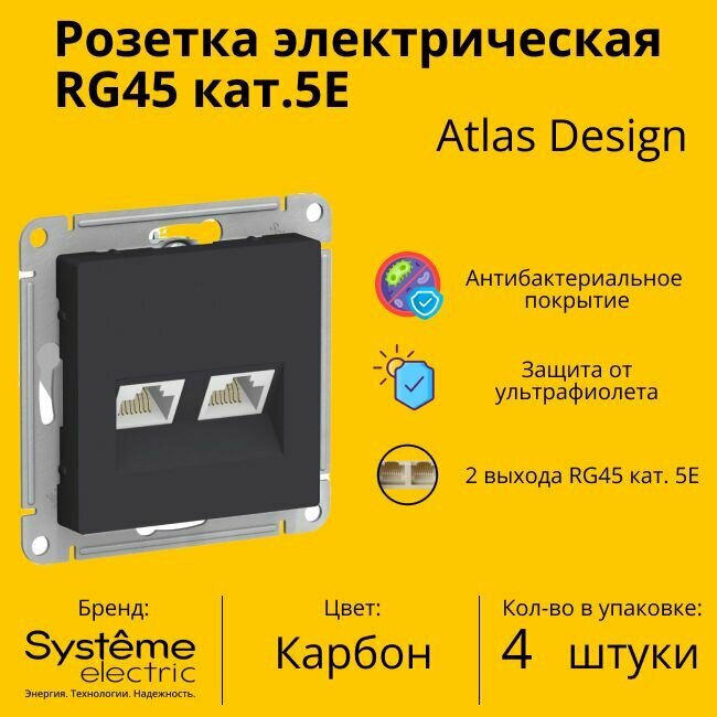 Купить Розетка двухместная компьютерная электрическая Systeme Electric Atlas Design RJ45 кат.5E, Карбон ATN001085 - 4 шт.