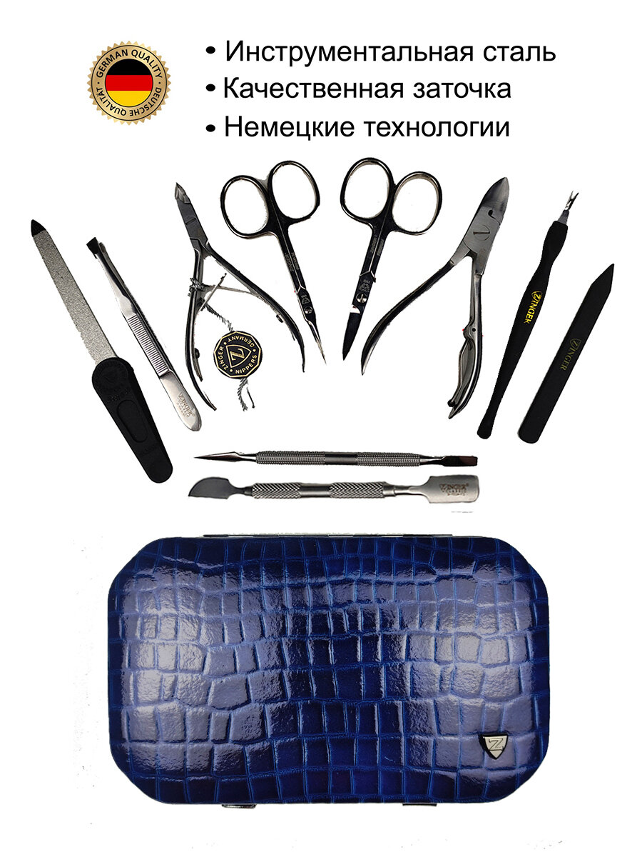 | Состав набора | кусачки для кутикулы, кусачки для маникюра, кусачки для педикюра, ножницы для кутикулы, ножницы для ногтей, пилка, пинцет, пушер для кутикулы, триммер, маникюрная палочка, шабер - 2 шт. |