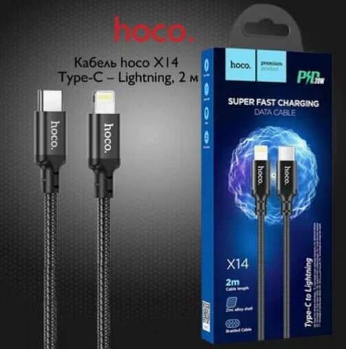 Кабель Type-C - Lightning для iPhone, Hoco X14, PD, 2 м, Черный