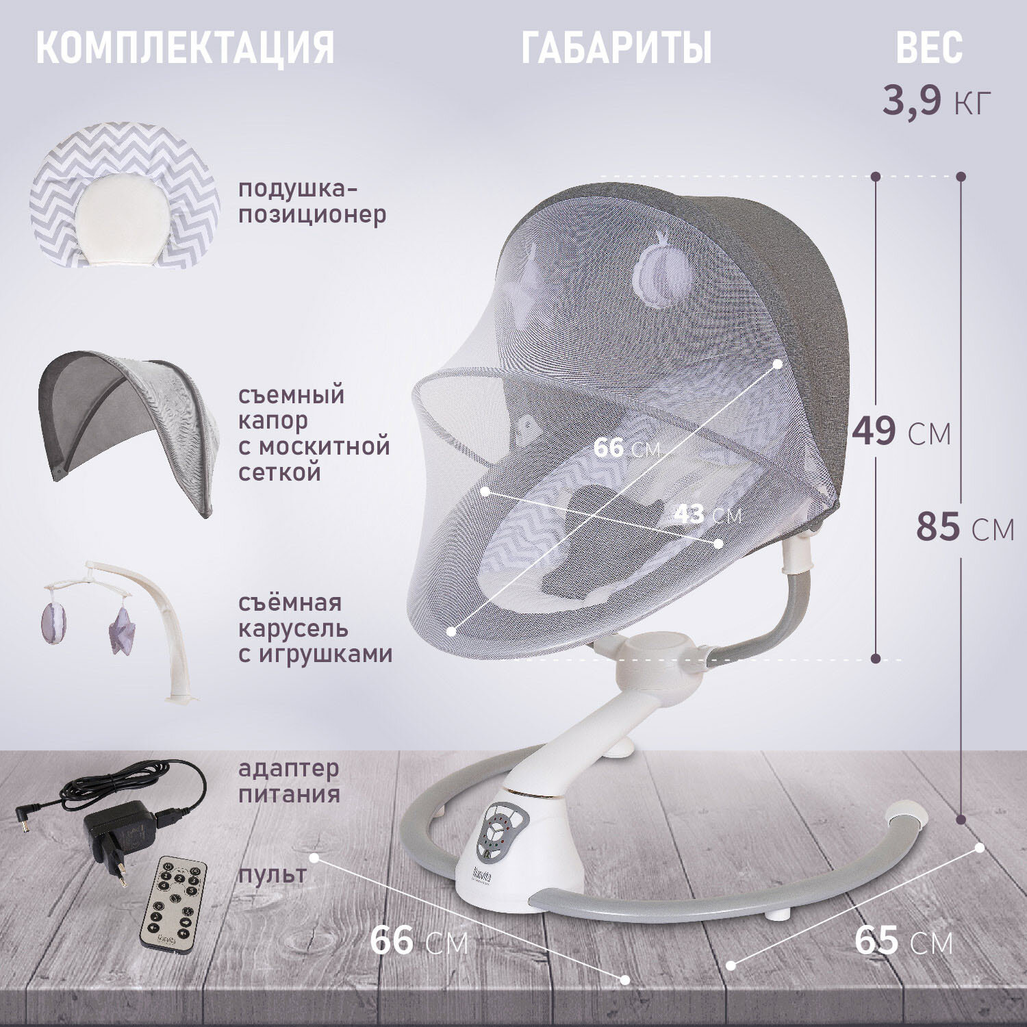 | Дополнительная информация | поворотное ложе на 360; функция «Умное укачивание»; таймер на 15, 30, 60 мин; наклон сиденья: 2 (170° и 155°) |