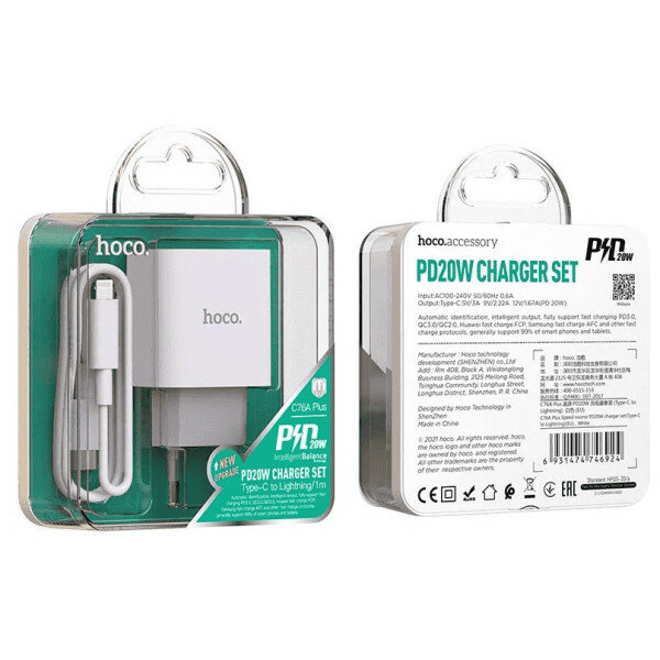 СЗУ HOCO C76A Plus Speed source PD20W charger set(Type-C TO Lightning), white интересное: