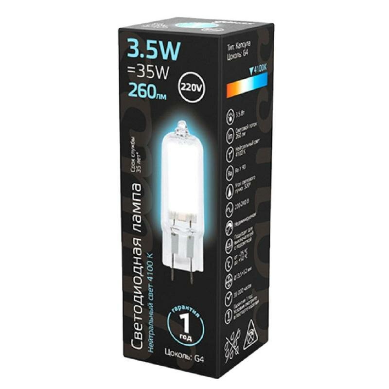 Лампа GAUSS светодиодная G4 3.5Вт цок.:G4 капсул. 220B 4100K св.свеч.бел.нейт. (упак.:1шт) (107807203)