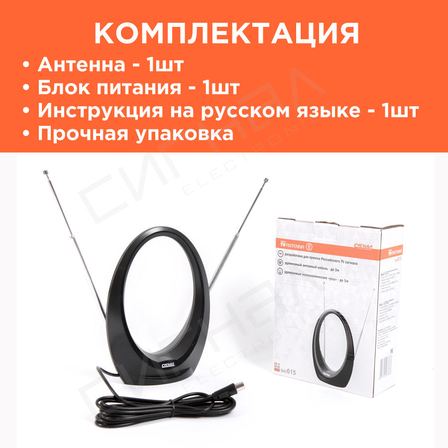 ТВ антенна Сигнал SAI 615, комнатная DVB-T2 и ДМВ+МВ активная, усы 1м, кабель 3м, 1 шт