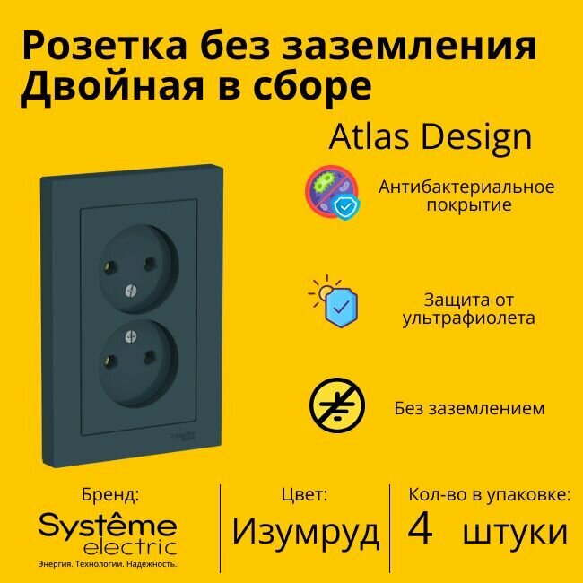 СохранитьРозетка электрическая двухместная Systeme Electric Atlas Design без заземления в сборе 16А, Изумруд - 4 шт. интересное: