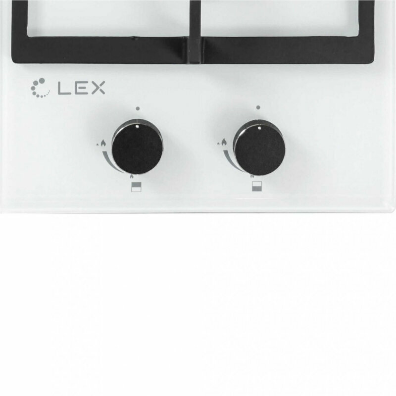 Варочная панель газовая Lex GVG 321 WH, 30 см, 2 конфорки, электроподжиг, газ-контроль, чугунная решетка, закалённое стекло, белый
