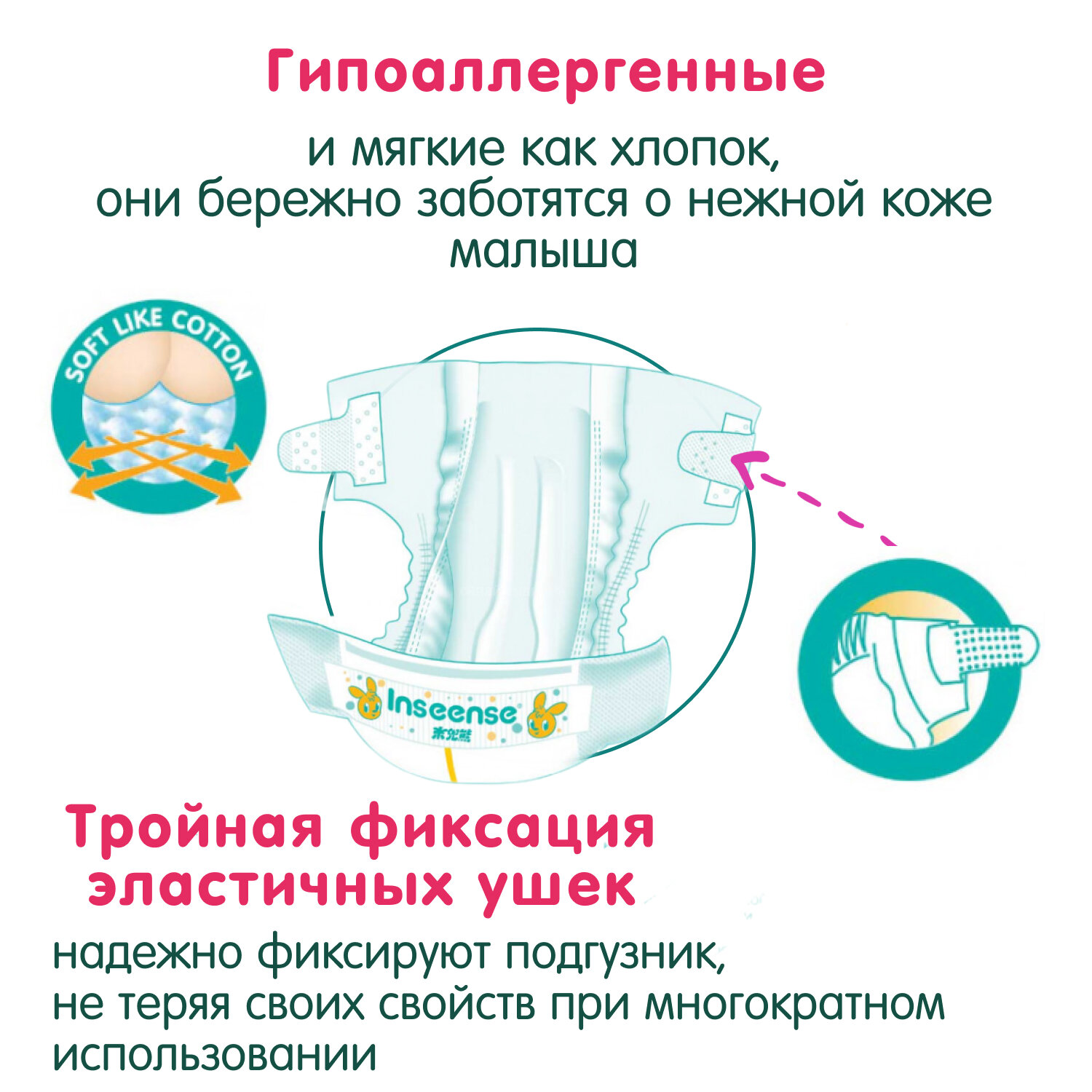 | Дополнительная информация | способ применения: раскройте подгузник и разложите его на плоской поверхности. Расправьте боковые резиночки, придав им вертикальное положение. Концы полосок с застежками-липучками должны располагаться сзади. Положите ребенка на подгузник. Расправьте бортики на передней части подгузника и застегните липучки на фронтальной полоске. Подтяните и расправьте края подгузника и защитные внутренние резиночки так, чтобы предотвратить протекание по бокам. Убедитесь, что подгузник не давит на животик и ребенку комфортно |