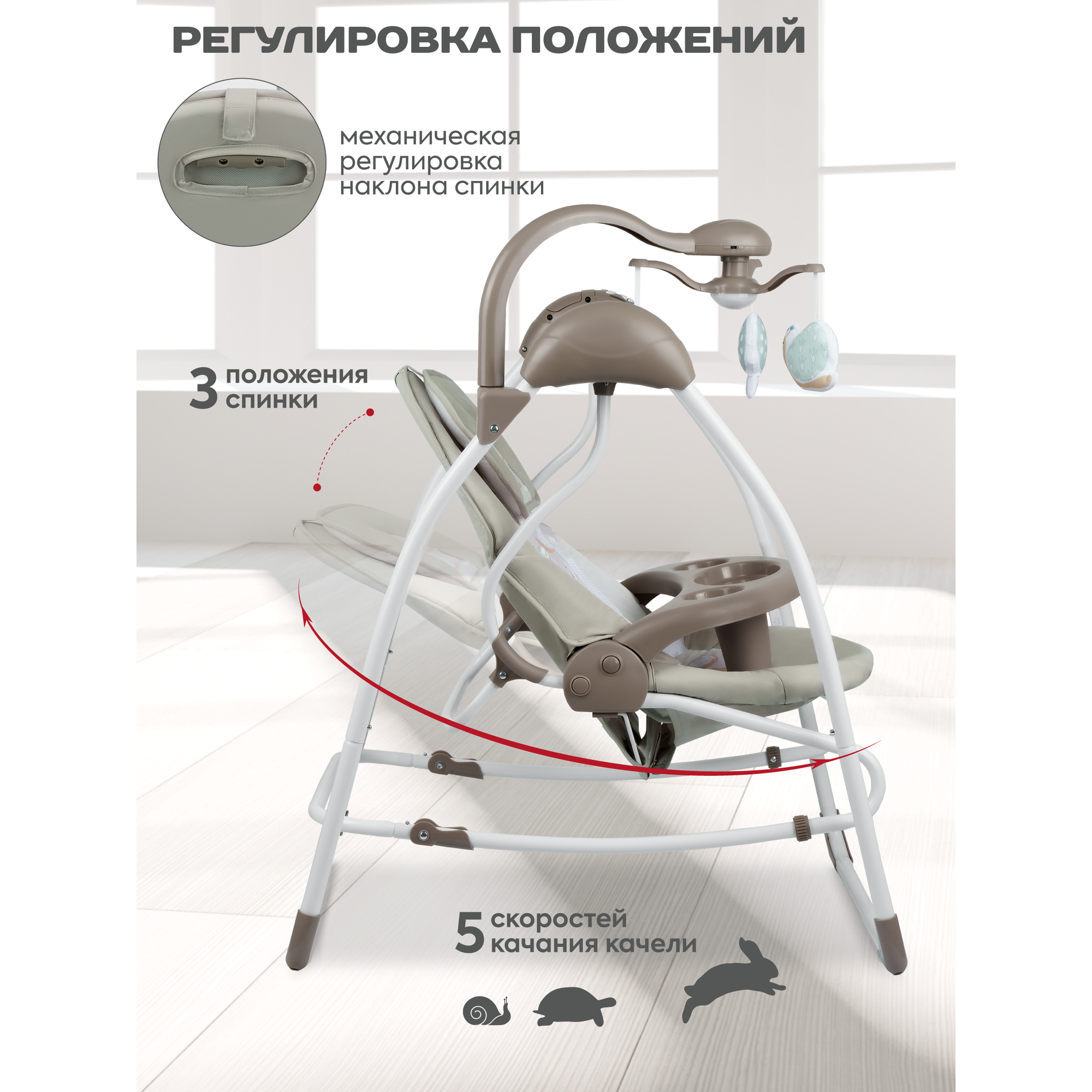 | Особенности | качели-трансформер / пульт ДУ / работа от батареек / регулировка громкости / таймер укачивания |