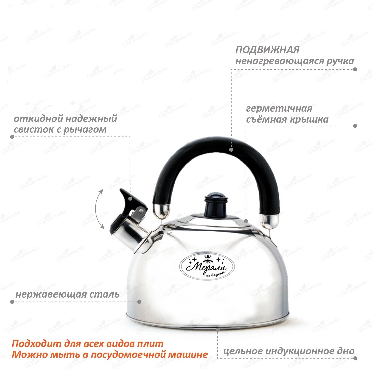 Чайник со свистком 2 литра Мерали из нержавеющей стали для всех видов плит интересное: