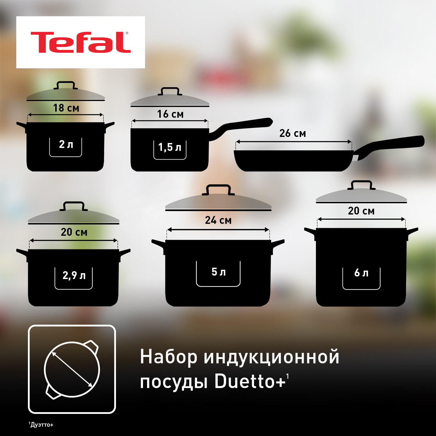 Набор посуды 11 предметов Tefal Duetto+ G732SB55: сковорода 26см, кастрюли 18/20/22/24 см и ковш 16 см с крышками