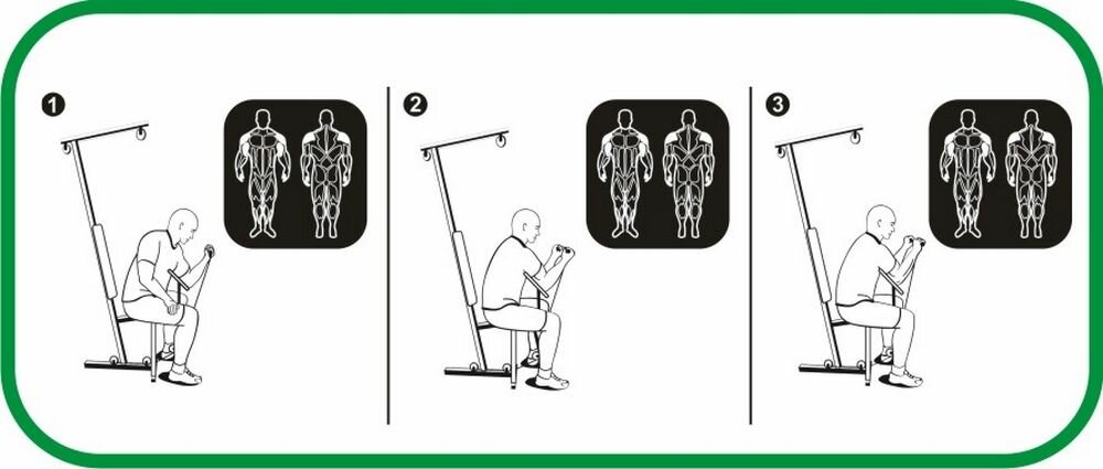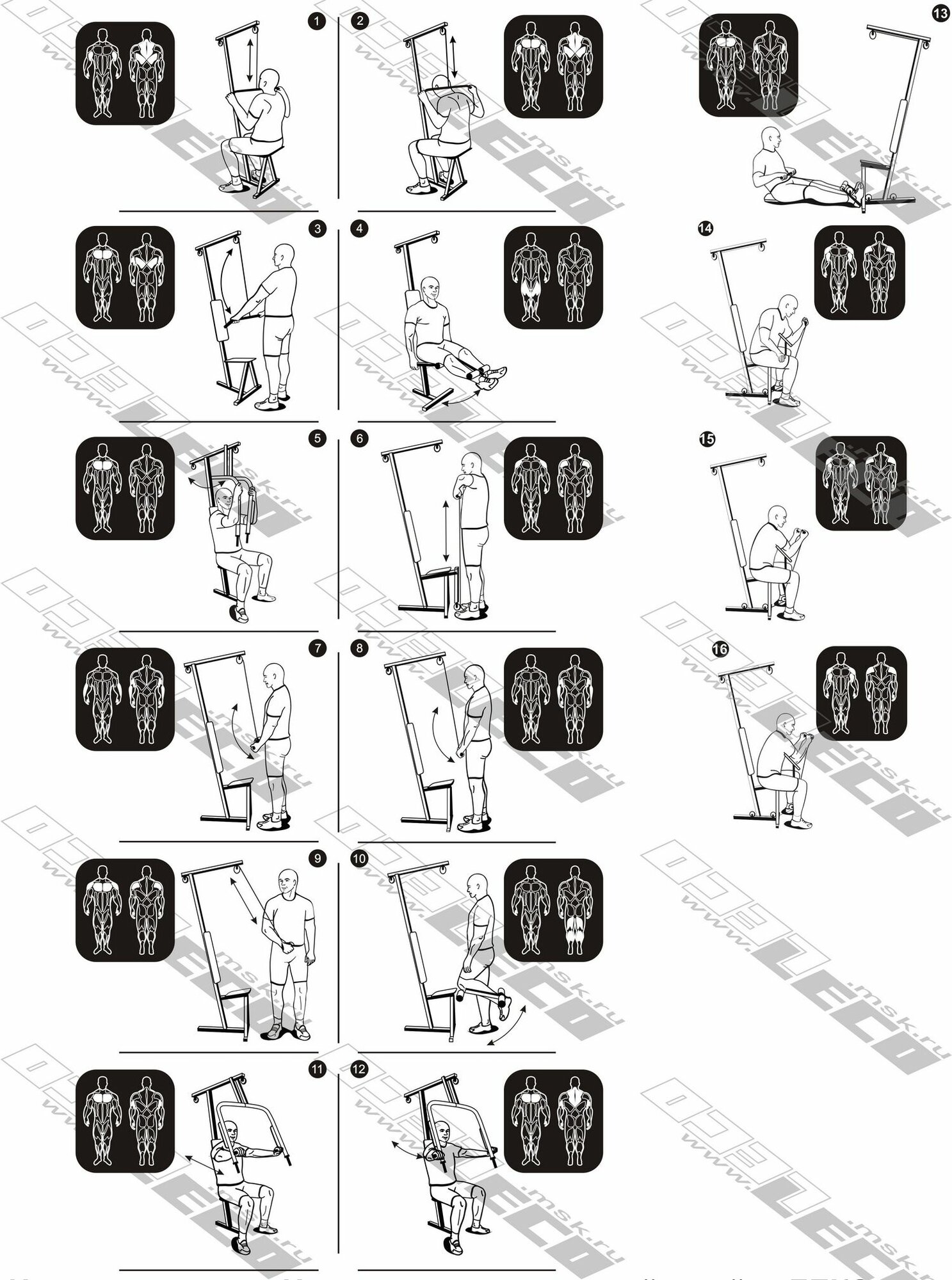 | Упражнения | верхняя тяга / жим от груди / разгибание рук / сведение рук / сгибание ног / сгибание рук |
