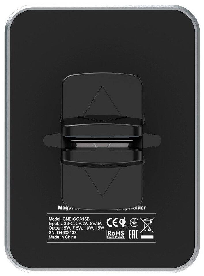 Car holder and wireless charger MegaFix, C-15, 15W, Input: USB-C: 5V/2A, 9V/3A; Output: 5W, 7.5W, 10W, 15W;89*65*12mm,0.195kg,black