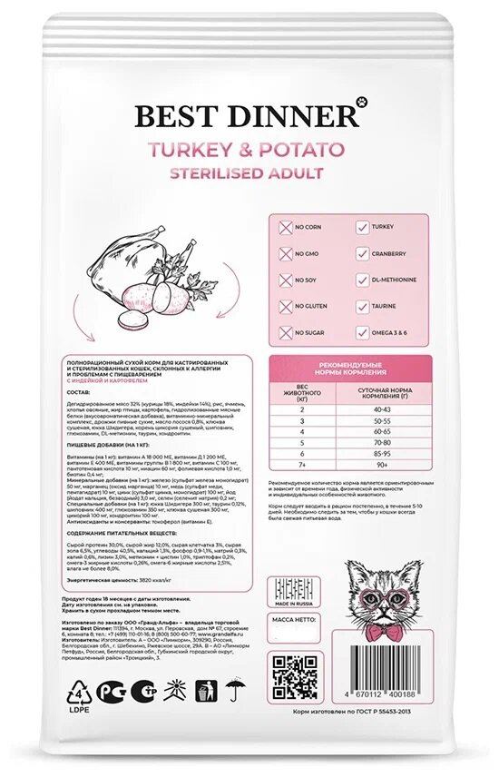 BEST DINNER CAT ADULT STERILISED TURKEY & POTATO для взрослых кастрированных котов и стерилизованных кошек с чувствительным пищеварением с индейкой и картофелем (0,4 кг)
