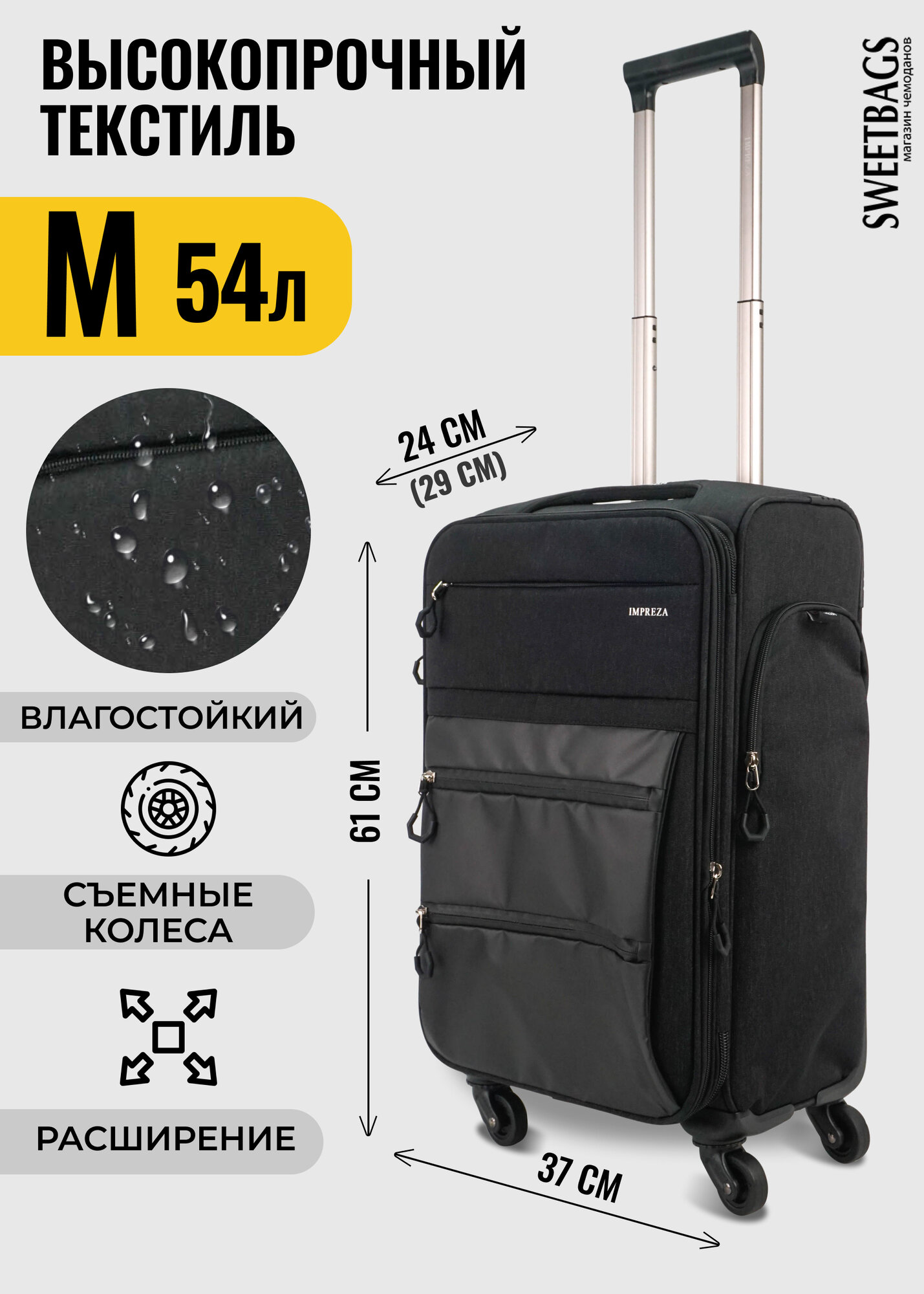 СохранитьЧемодан Sweetbags текстильный средний с расширением с 4-мя съемными колесами (waterproof) черный M интересное: