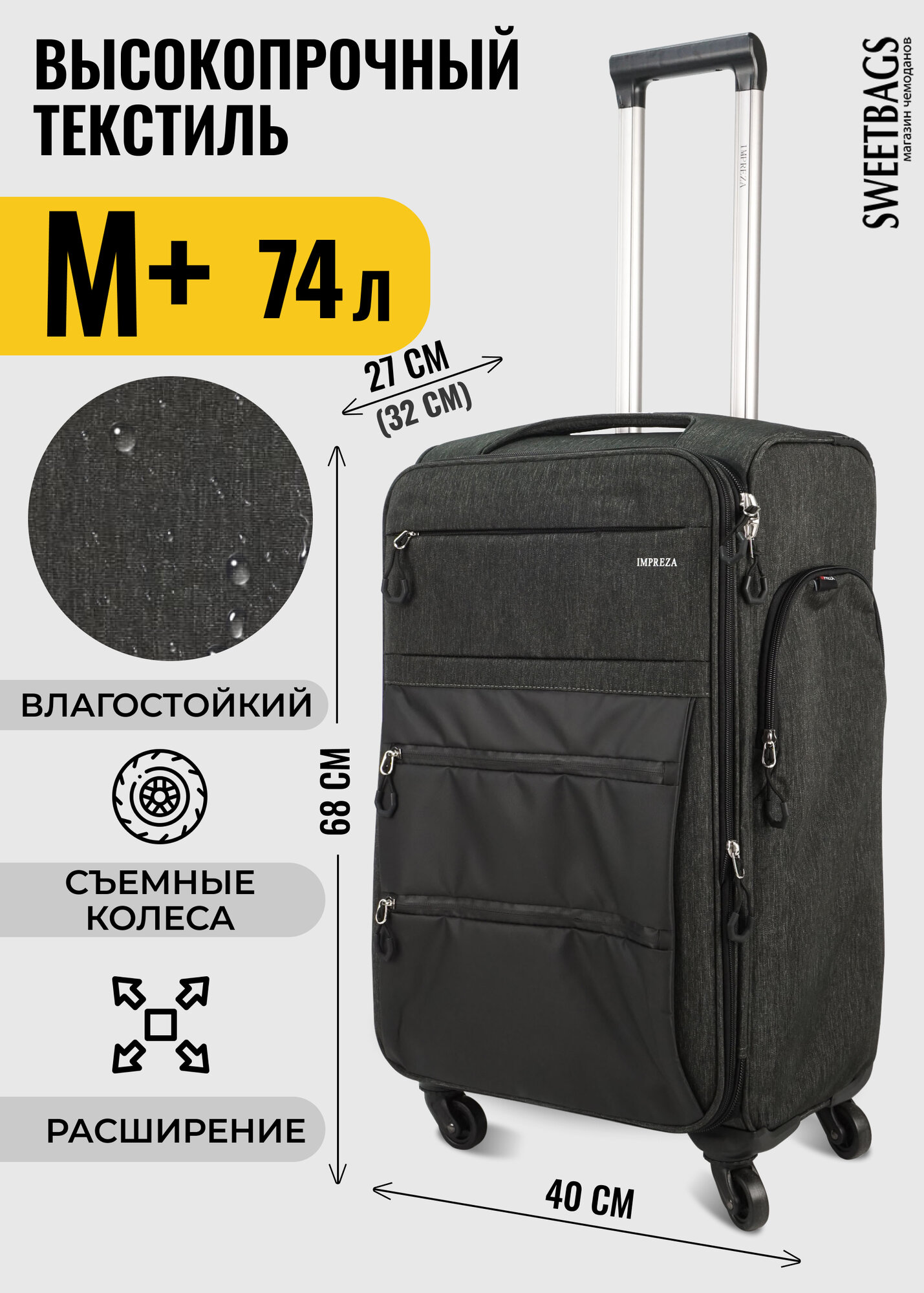 СохранитьЧемодан Sweetbags текстильный средний с 4 съемными колесами и расширением (waterproof) темно-серый M+ интересное: