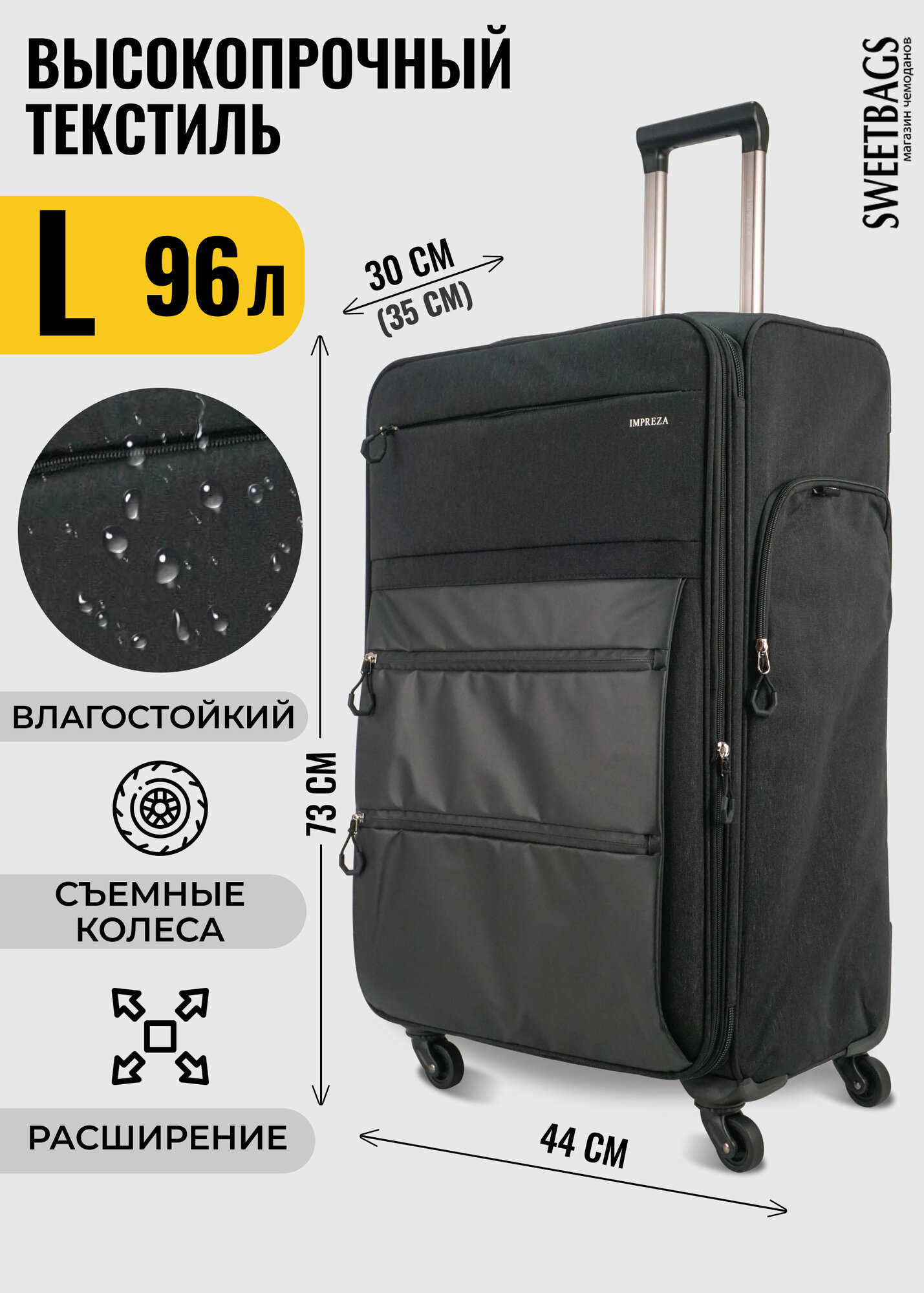 СохранитьЧемодан Sweetbags текстильный большой с расширением с 4-мя съемными колесами (waterproof) черный L интересное: