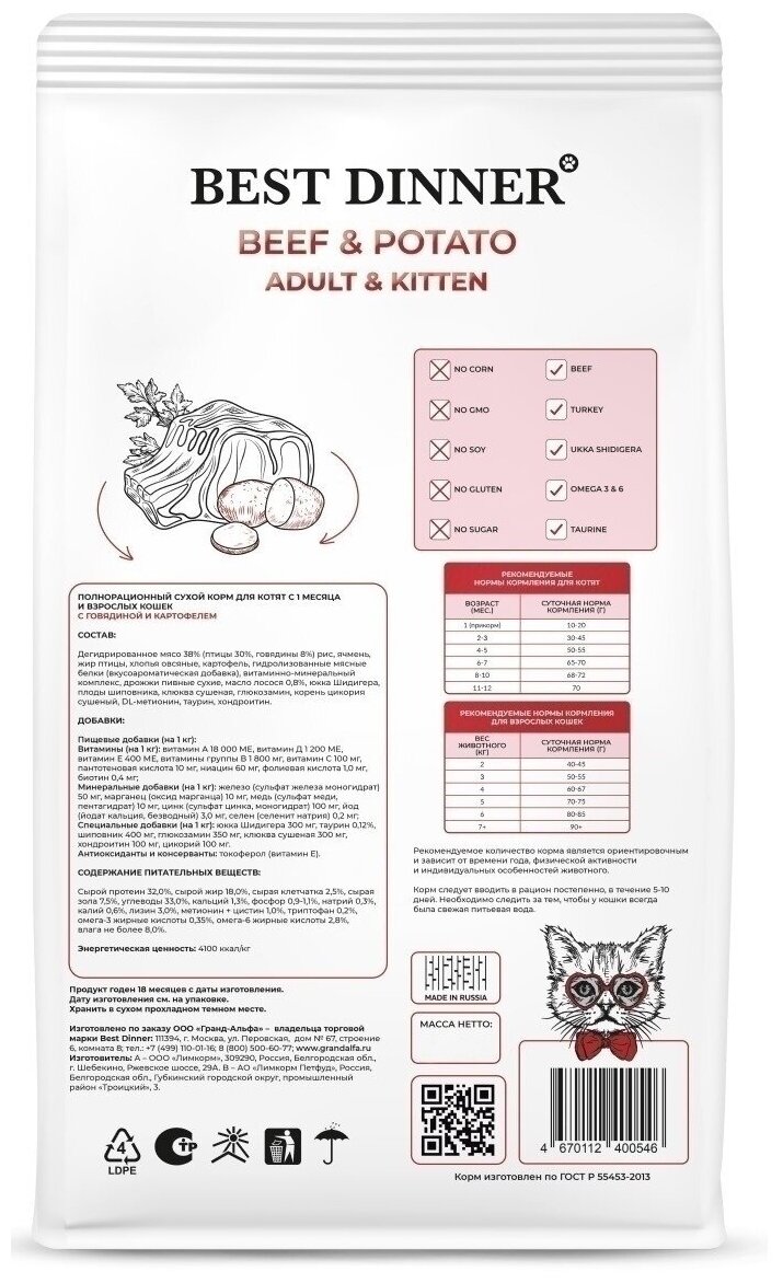 [24128] Best Dinner Adult Kitten Beef Potato 10 кг сухой корм для котят с 1 месяца и взрослых кошек с Говядиной и картофелем
