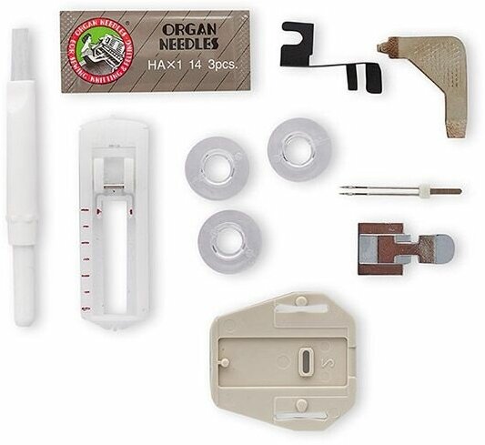 -лапки в комплекте для молнии и пуговиц -рукавная платформа -нитевдеватель. в принципе всё, что нужно, для работы. получается у меня шить очень красиво, практически как фабричные вещи. |