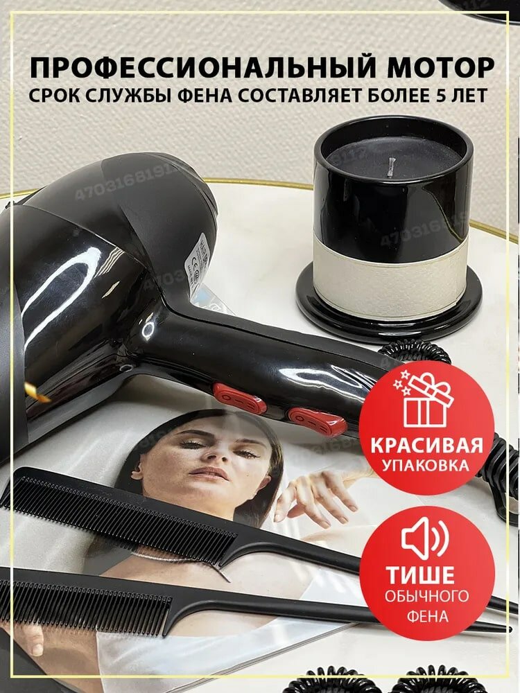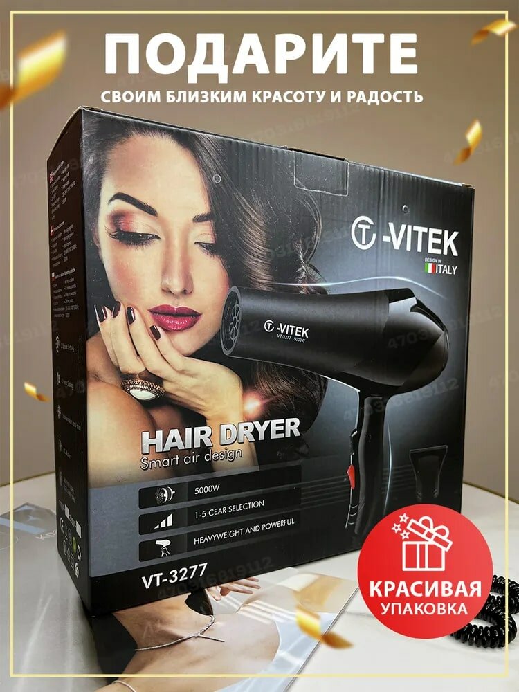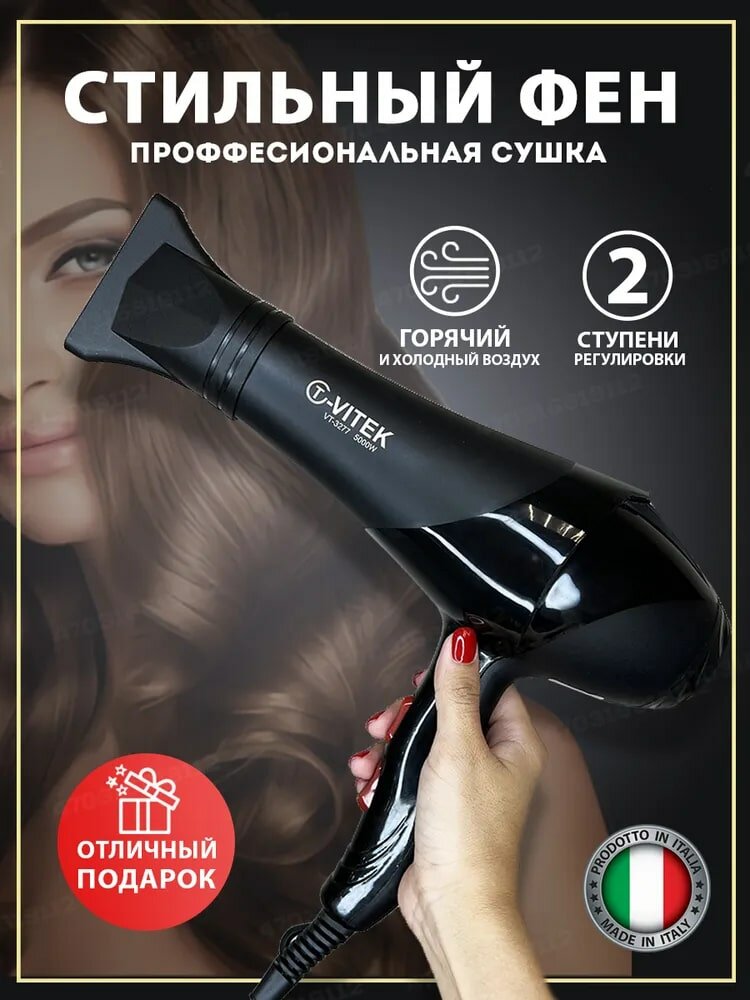 Фен для волос профессиональный с диффузором VT/ фен с насадками / фен для волос 3 в 1 / выпрямитель для волос, черный интересное: