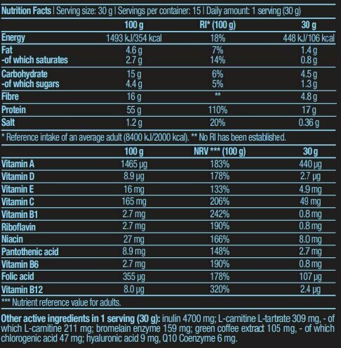 | Дополнительная информация | назначение: заменитель питания без сахаров; рекомендации по применению: Смешайте одну порцию (30 г = 1 мерная ложка = 3 столовых ложки) с 300 мл воды. Выпивайте этот коктейль один раз в день вместо еды.; форма выпуска: порошок; состав: В одной порции (30 г): 106 ккал, 15 г белка, 5,1 г углеводов, 4,8 г клетчатки, 1,8 г жиров, 160 мг фермента бромелайна для переваривания белка, 12 г витаминов,кальций и магний, 105 мг экстракта зеленого кофе, 300 мг L-карнитина L-тартрат, Гиалуроновая кислота и кофермент Q10 |