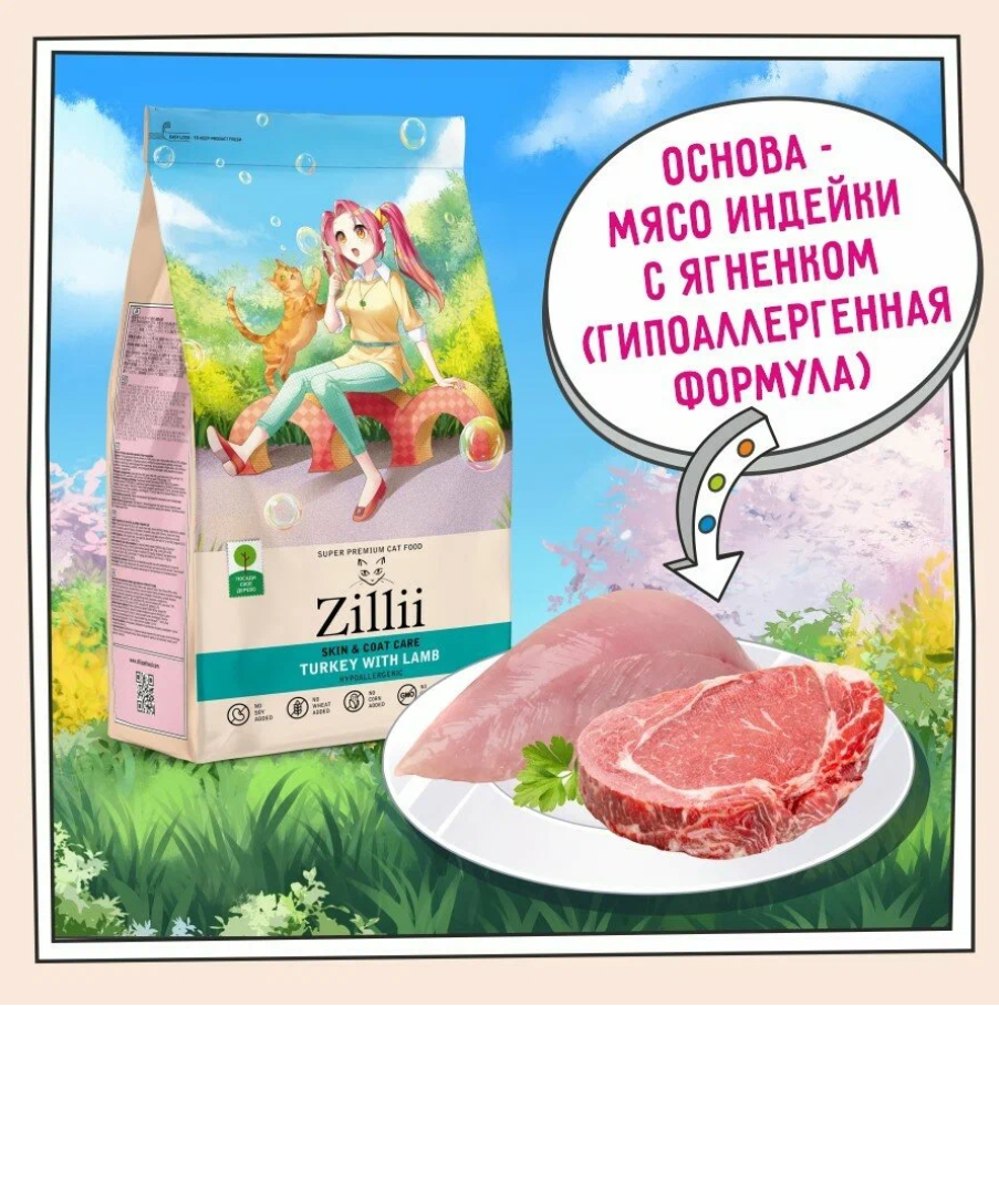 Корм сухой ZILLII (Зилли) Skin & Coat Care, для кошек поддержка здоровья кожи и шерсти Индейка с Ягнёнком 2 кг