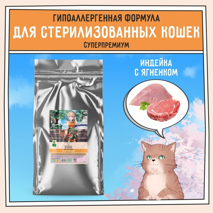 Сухой корм для стерилизованных кошек и кастрированных котов 2 кг, гипоаллергенный ZILLII (Зилли), Индейка с Ягнёнком
