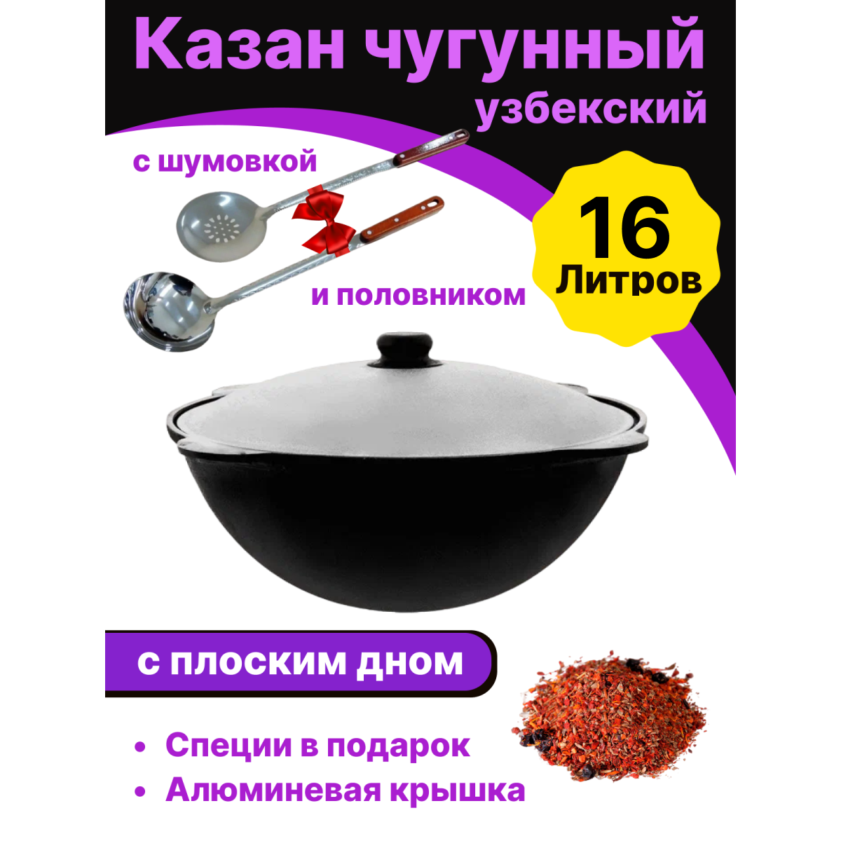 Казан чугунный Узбекский Наманган 16 л. плоское дно, диаметр 46 см. Крышка, шумовка 46см. + половник 43см. в комплекте. интересное: