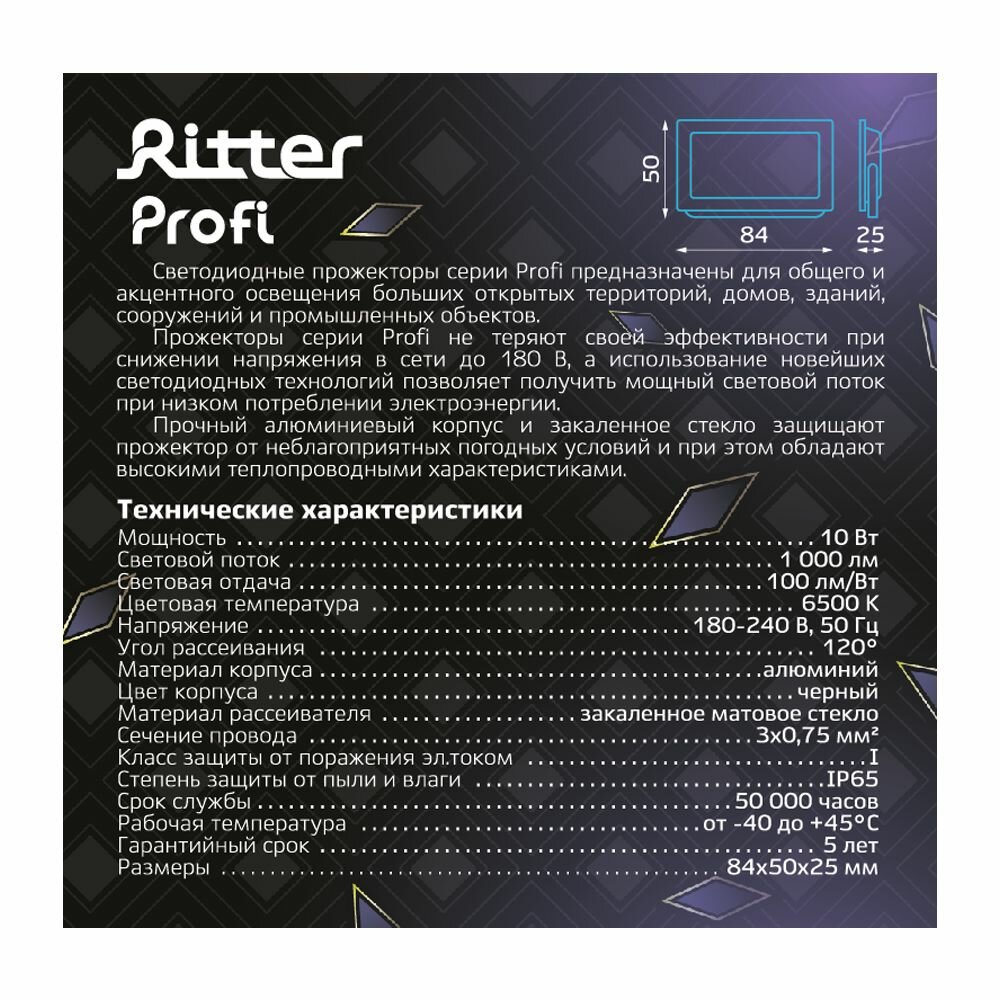 Купить Прожектор светодиодный уличный Ritter Profi 53405 5 10 Вт 1000 Лм 180-240В холодный белый свет 6500К IP65 черный