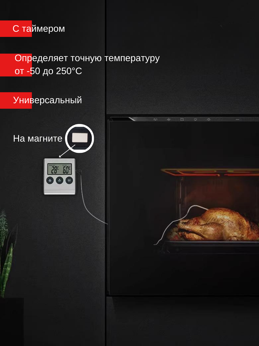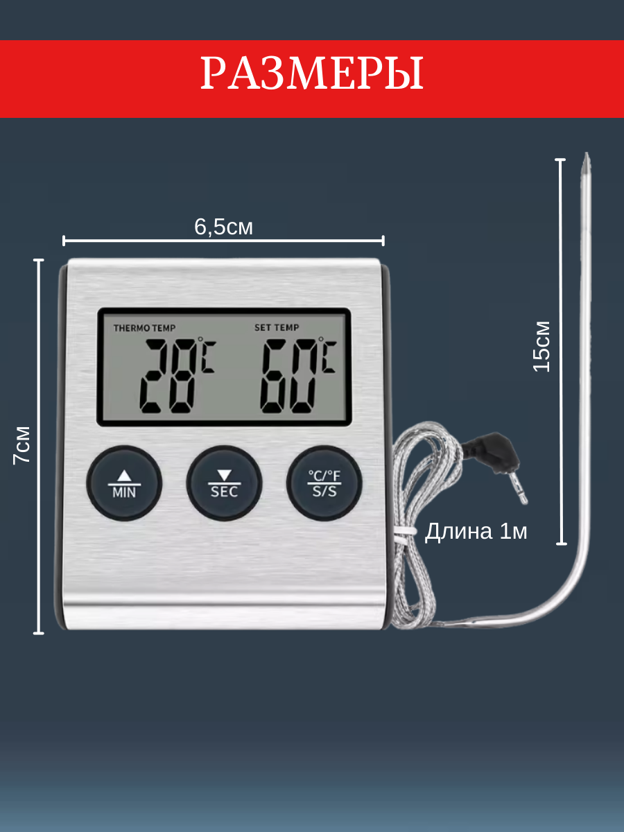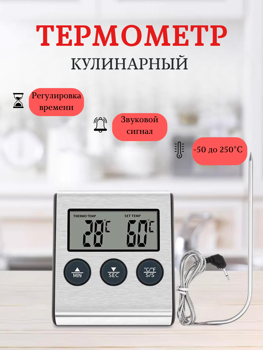 Кулинарный термометр электронный со щупом из нержавеющей стали, термометр для еды, мяса, вина, провод 1 метр / таймер кухонный