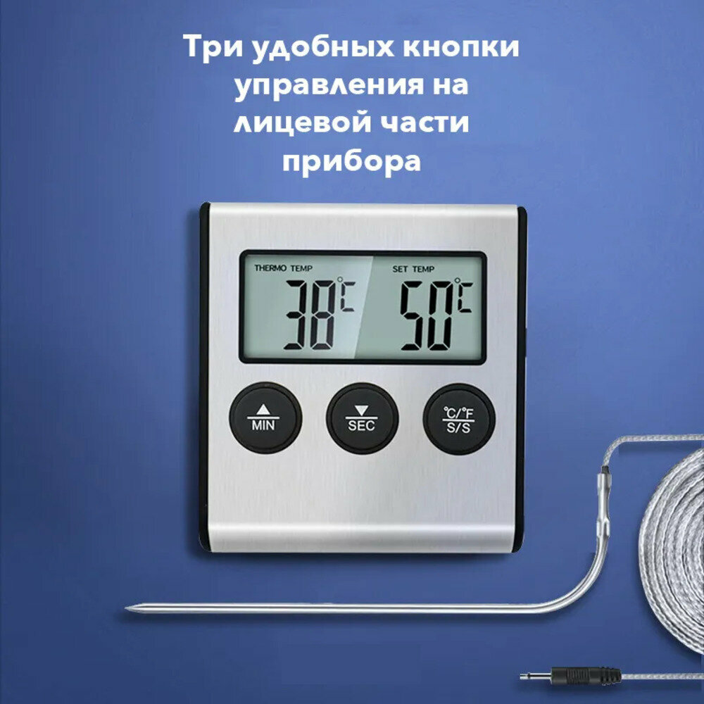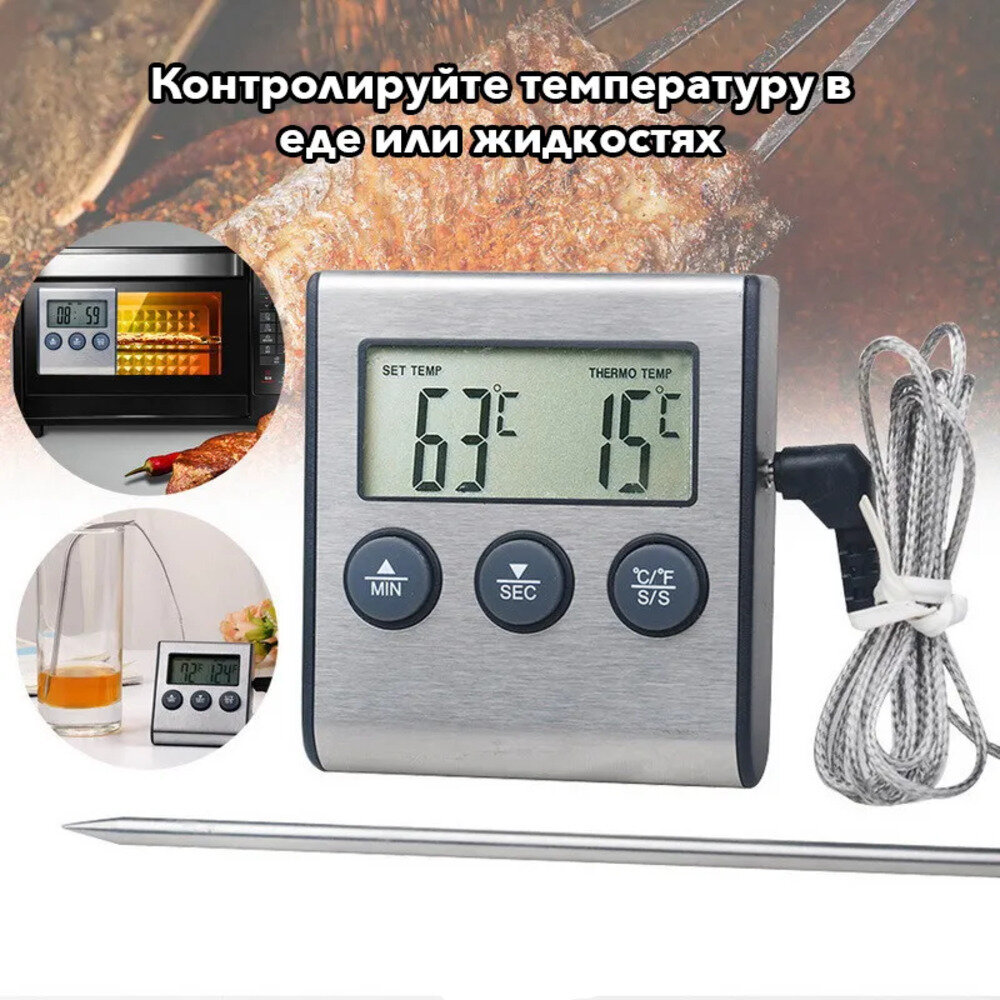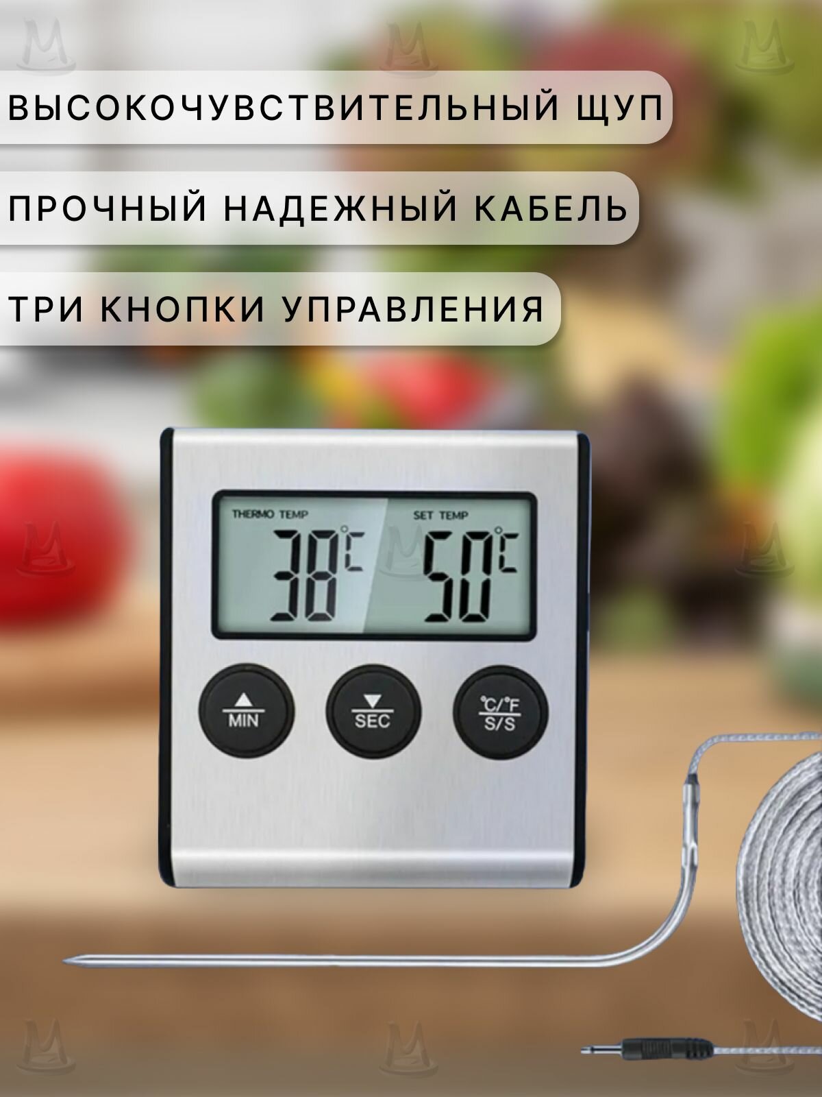Кулинарный термометр электронный со щупом из нержавеющей стали, термометр для еды, мяса, вина, провод 1 метр / таймер кухонный