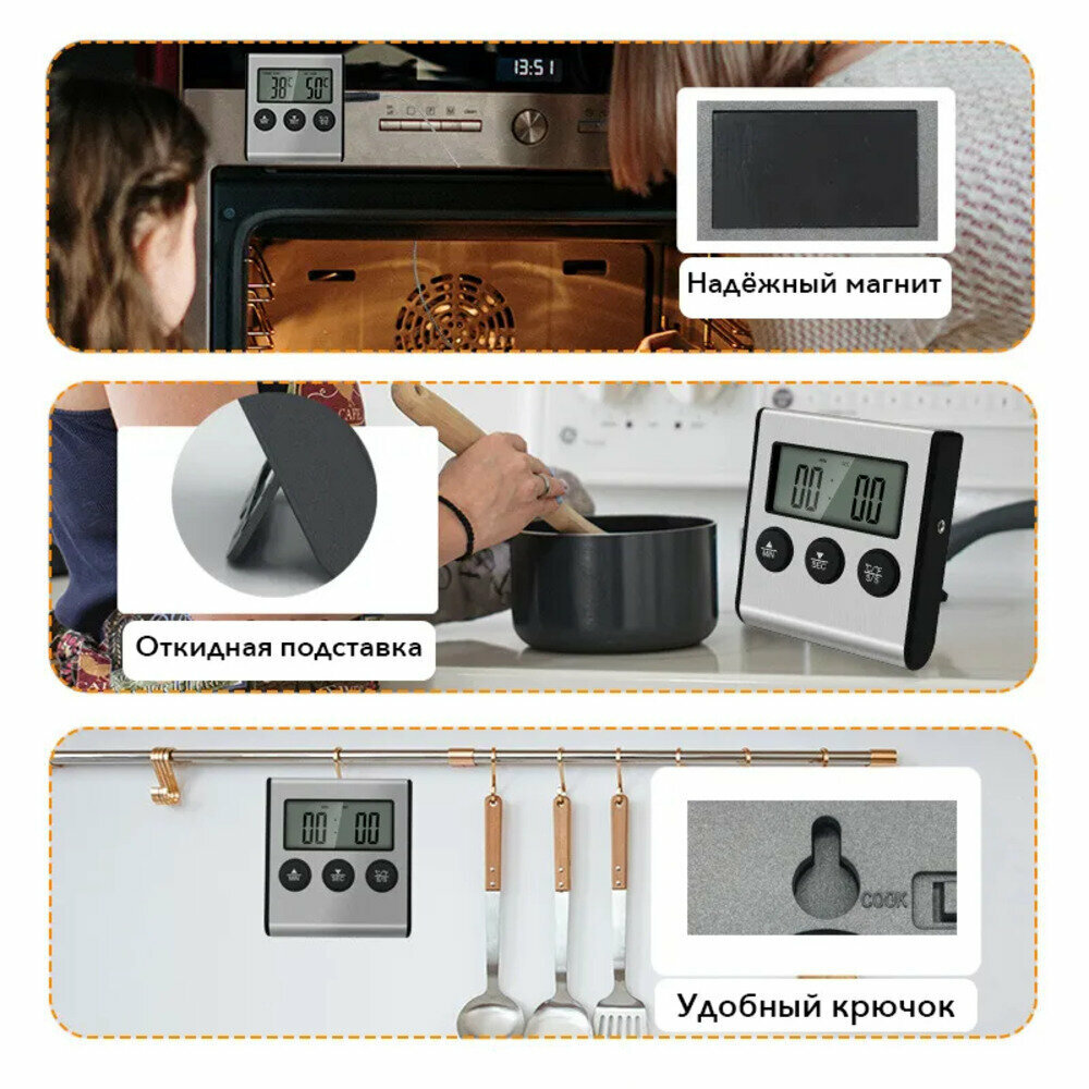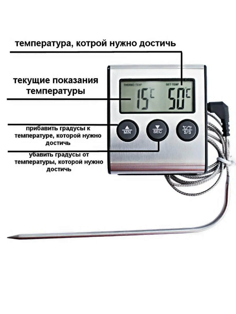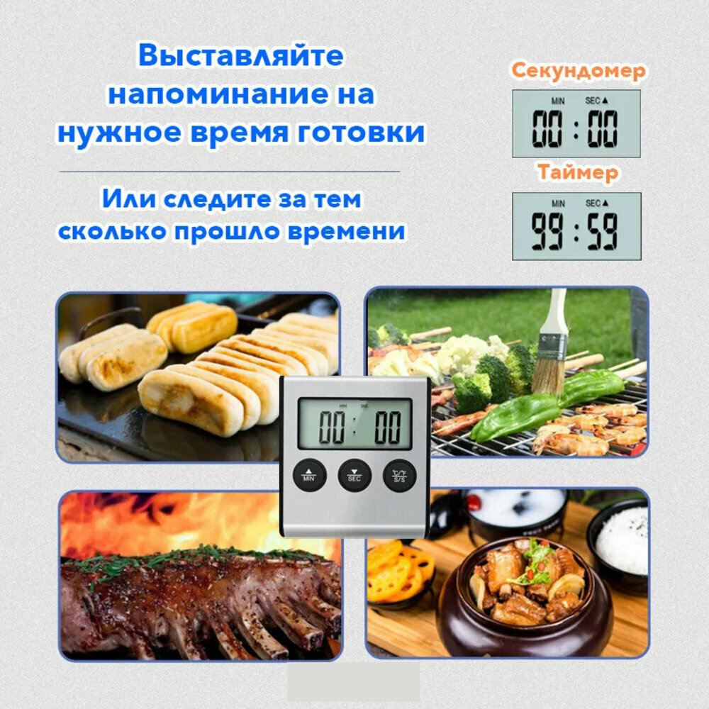 Кулинарный термометр электронный со щупом из нержавеющей стали, термометр для еды, мяса, вина, провод 1 метр / таймер кухонный