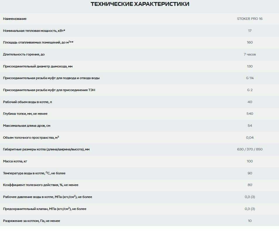 | Топливо | древесные брикеты / дрова / пеллеты / торф / уголь / угольные брикеты |
