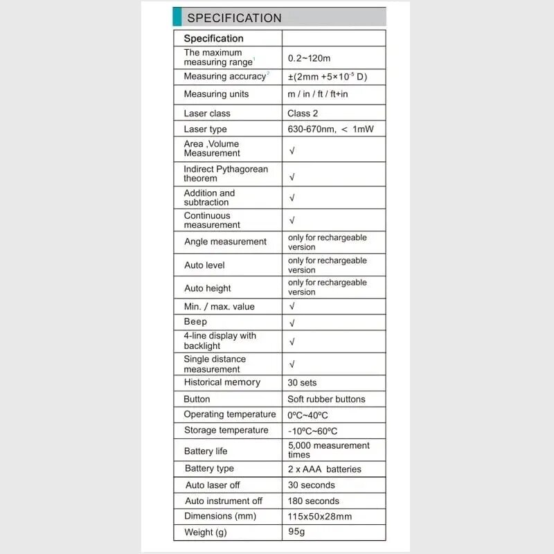 | Функции и особенности | автоматическое отключение, определение мин. и макс. значений, функция Пифагора, функция непрерывного измерения, функция расчета объема, функция расчета углов, функция сложения/вычитания |
