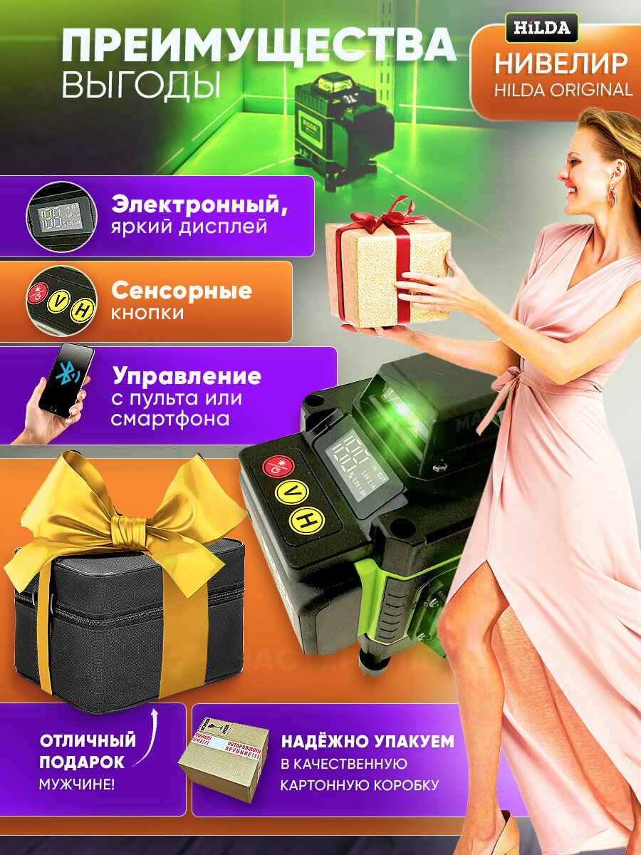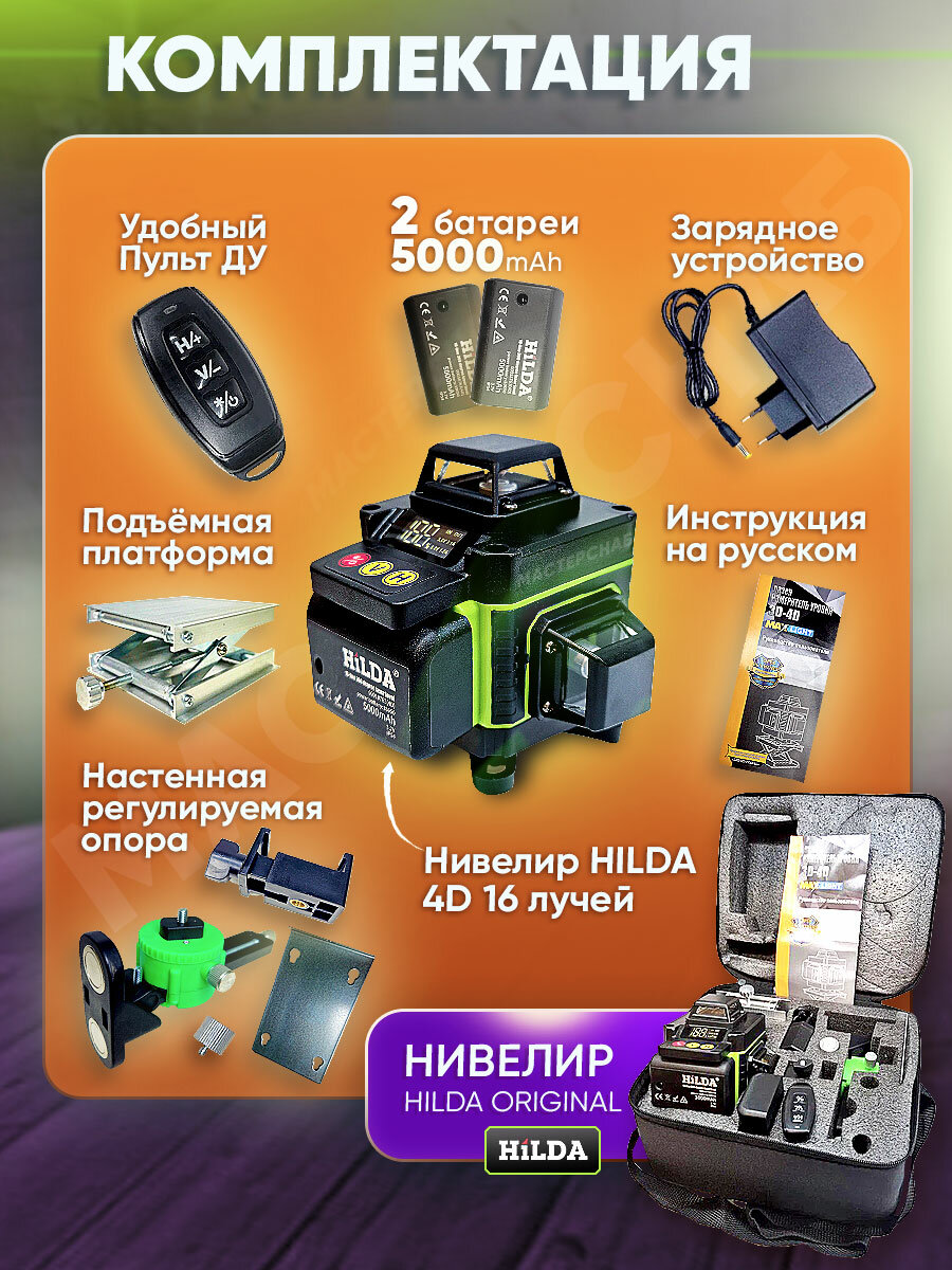 Лазерный уровень блютус HILDA 4D, 16 линий, 2 аккумулятора 5000 мА·ч, зеленый луч, калибровка интересное: