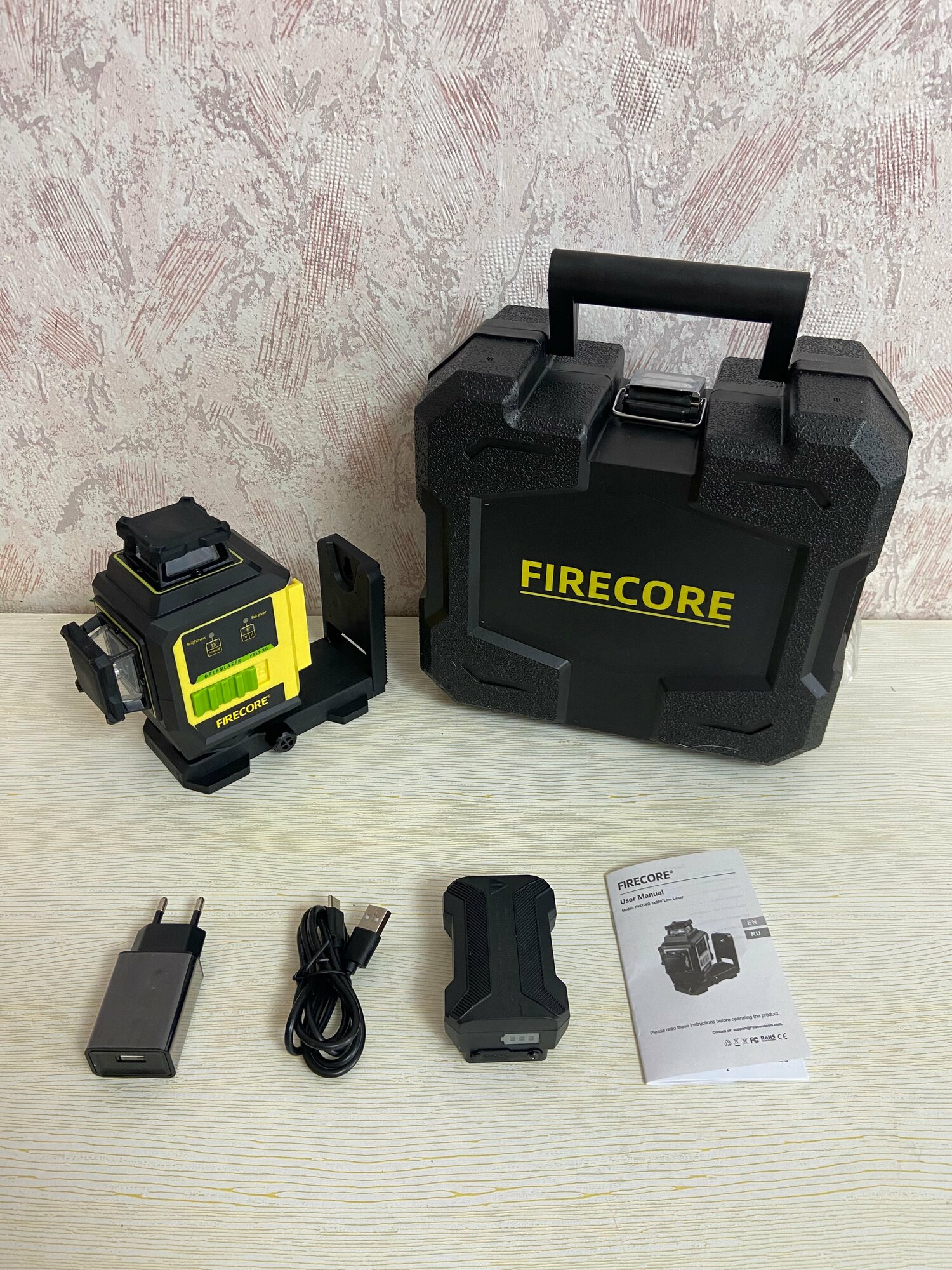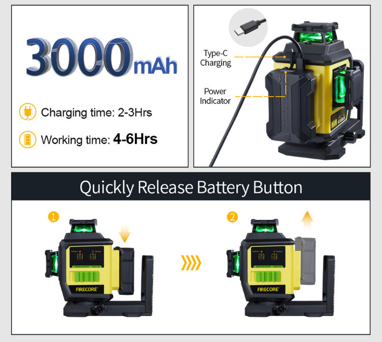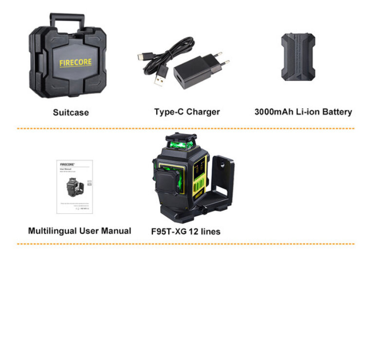 Лазерный уровень Firecore F95T-XG , 3D, 12 лучей , Аккумулятор 3.7V 3000 мАч, в кейсе
