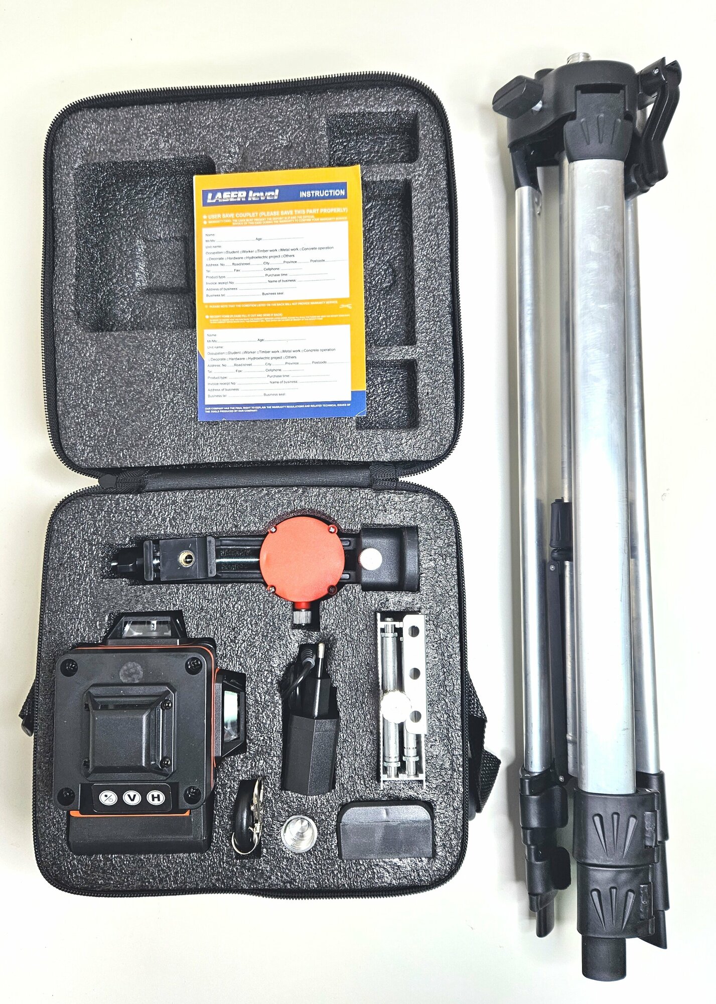 | Дополнительная информация | Комплектация: лазер х1, аккумулятор х2, зарядное устройство х1, кейс/сумка х1, кронштейн магнитный с пластиной х1, подъемная платформа х1, переходник для штатива х1, штатив 1.5 м, пульт ду с батарейками х1, инструкция/гарантийный талон х1. |