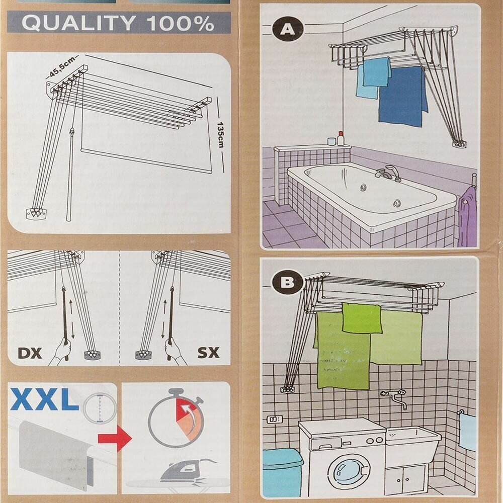 | Отзыв: | Сушилка 100см, тогда стена на которую вешаете должна быть чуть больше (если крепите к стене, а не к потолку). К примеру, 120см. Указанное расстояние необходимо, чтобы верёвки не цеплялись за перекладины. |