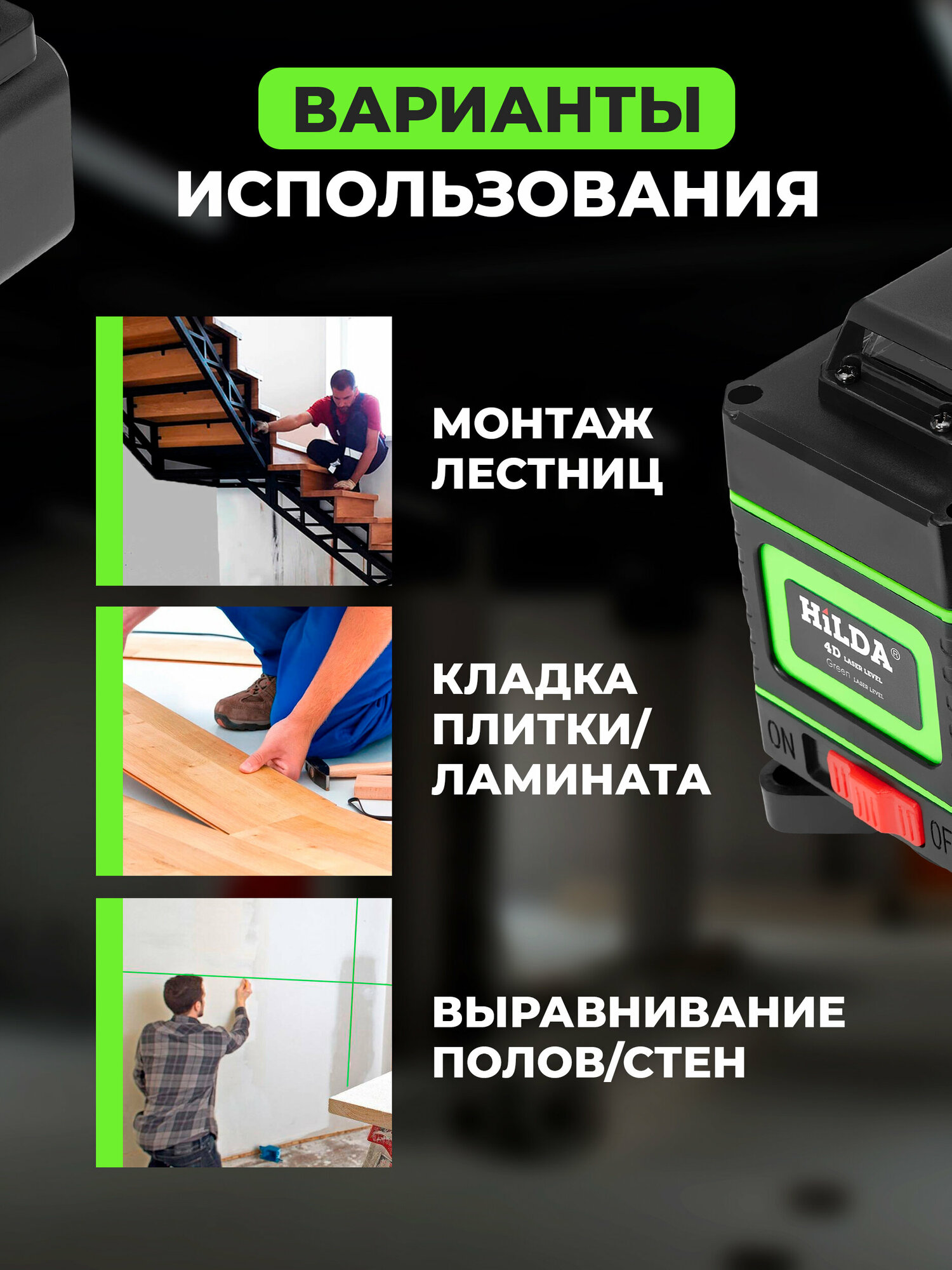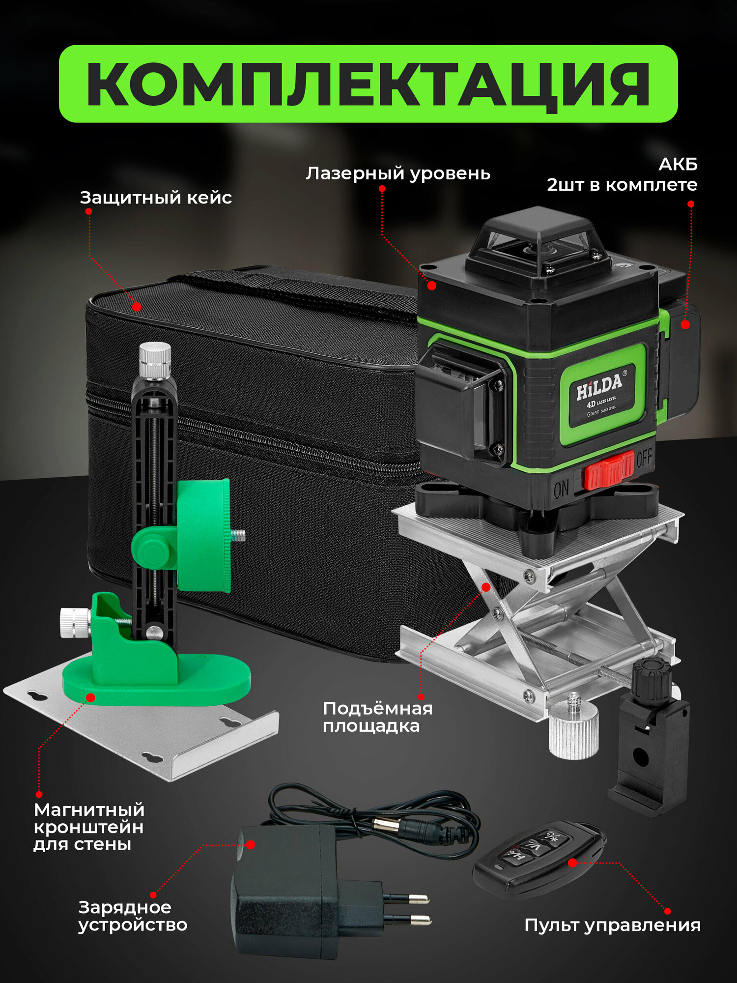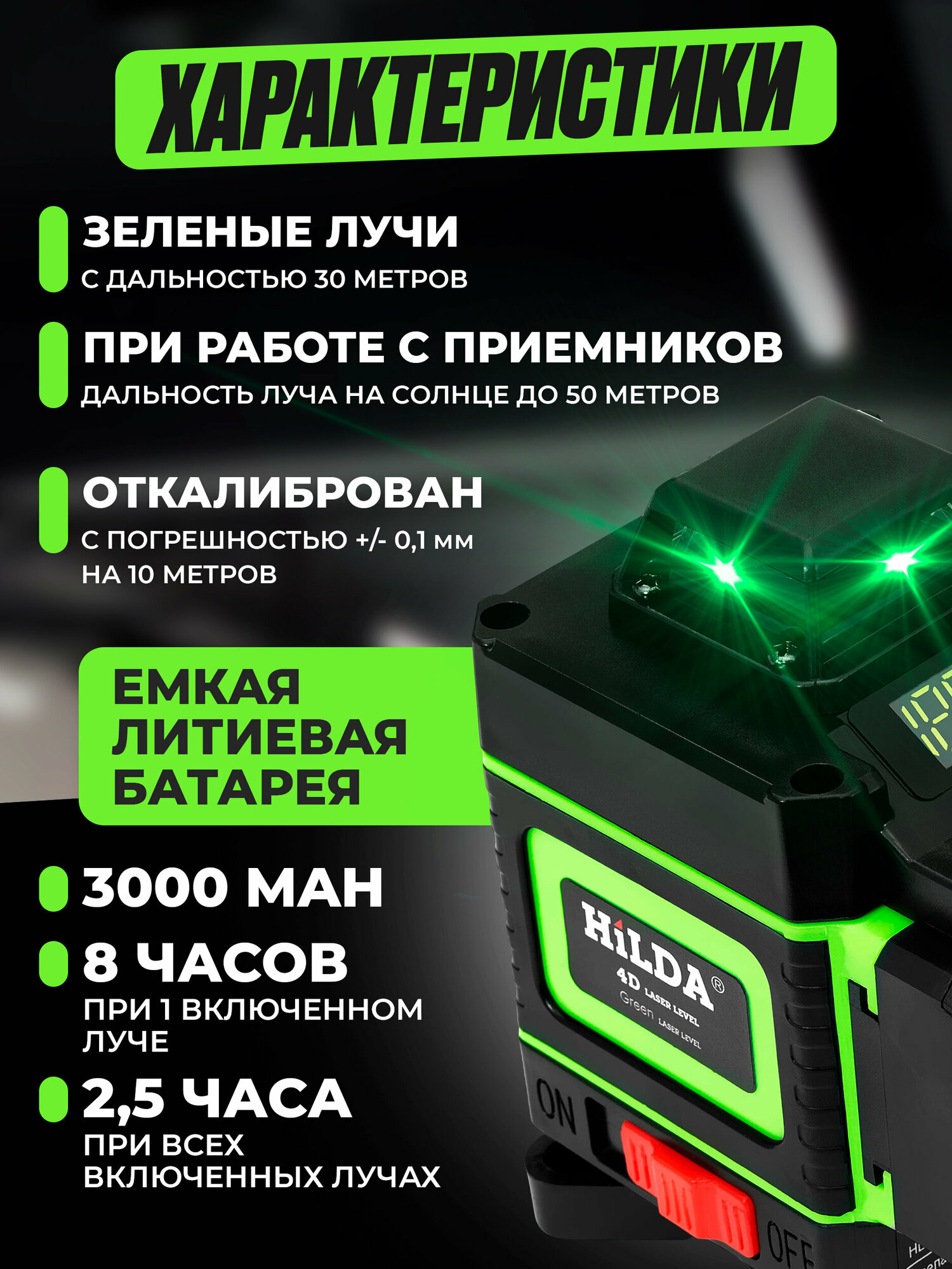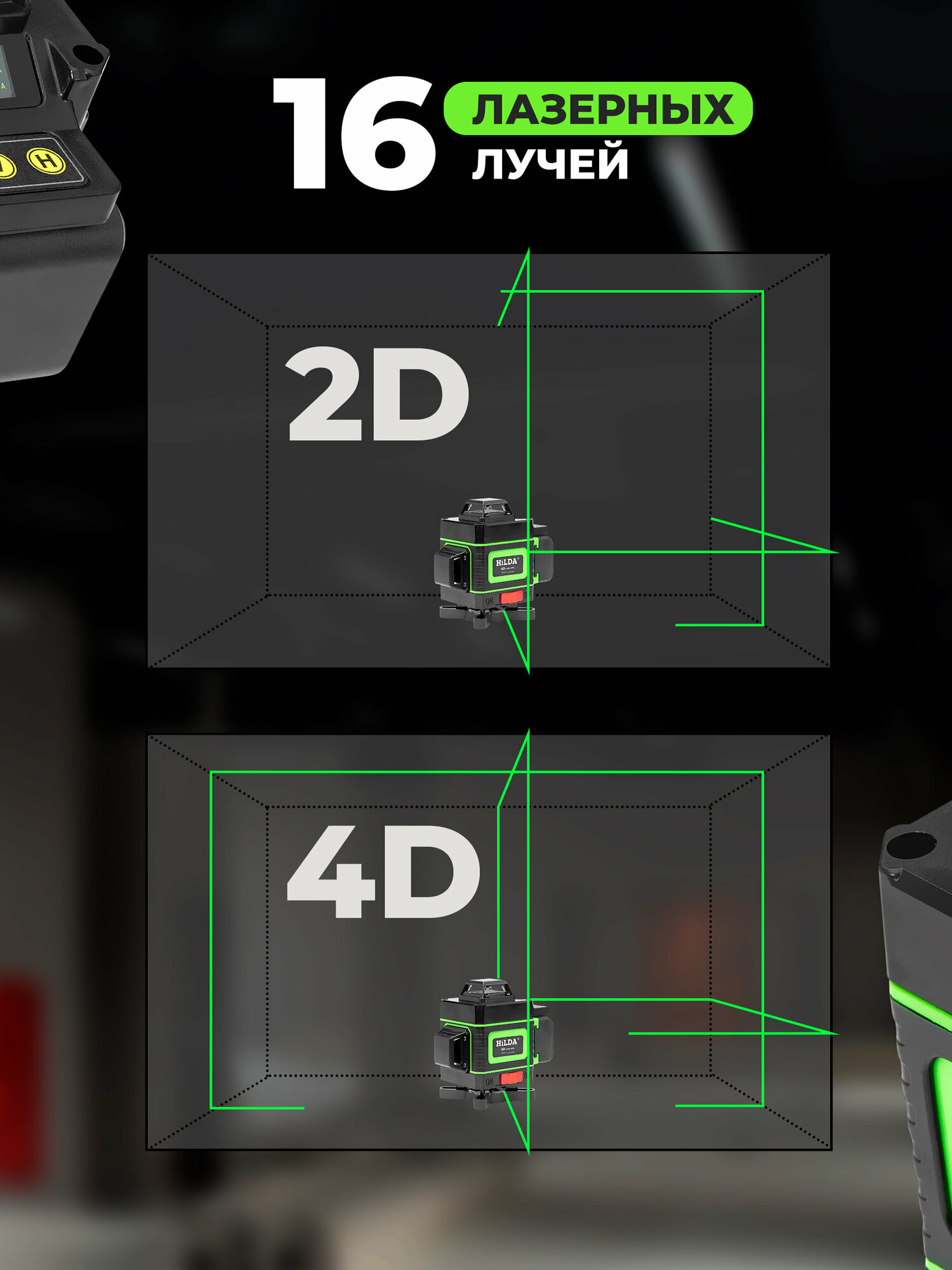 Лазерный уровень HILDA 4D 16 линий 2 аккумулятора зеленый луч поверка интересное: