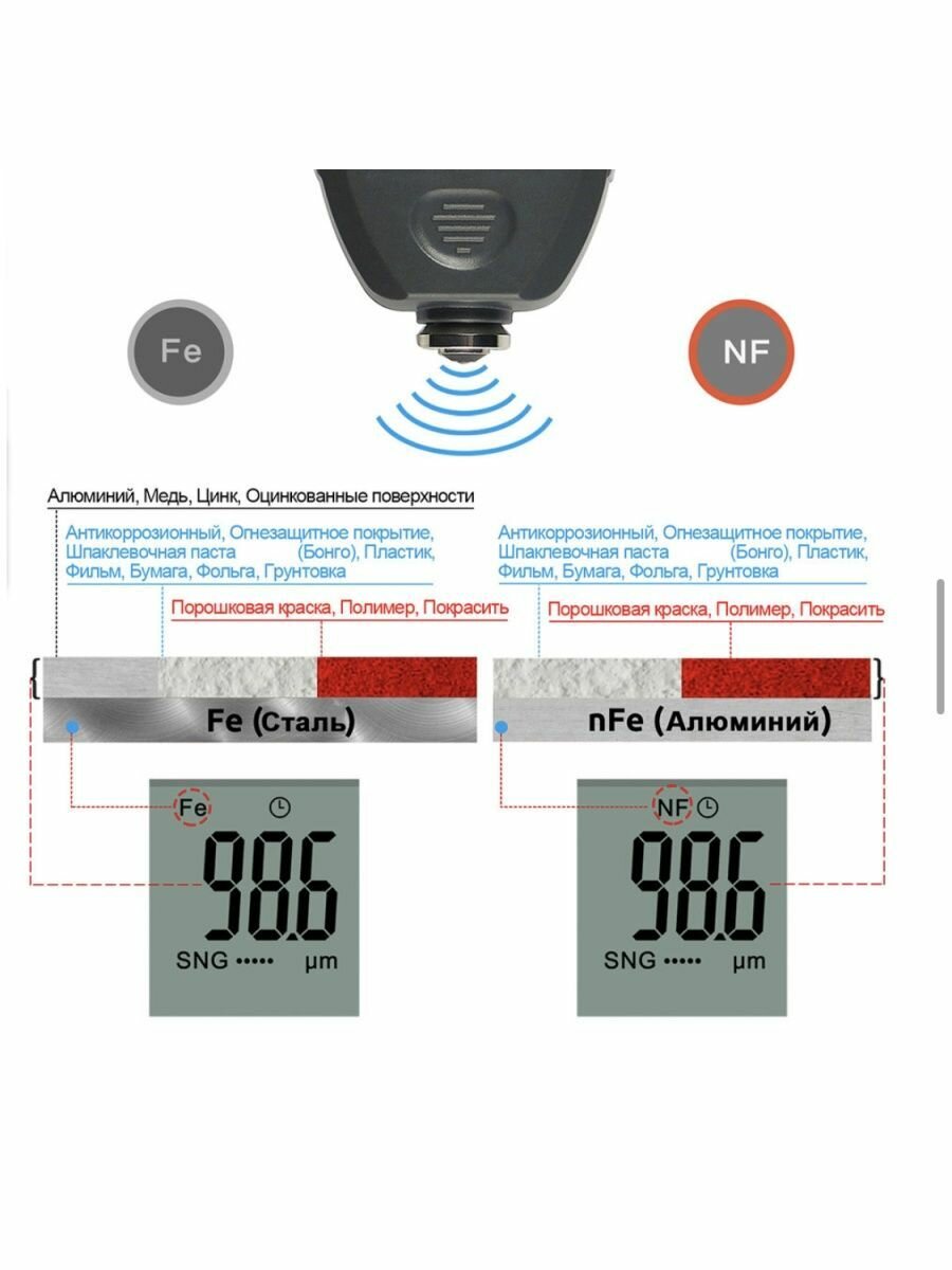 | Принцип измерения | Замеряет толщину лакокрасочного покрытия на металле и на алюминиевых поверхностях. |