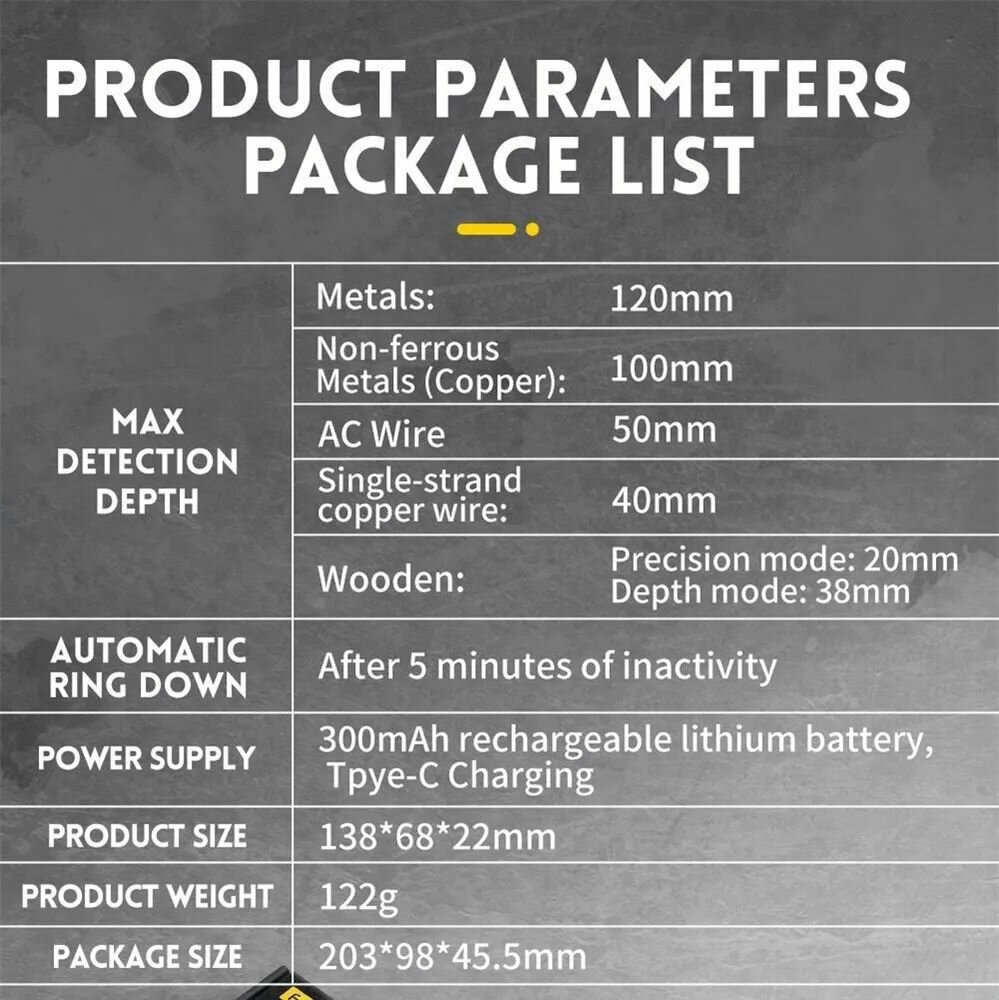 | Обнаруживаемые материалы | деревянные конструкции, цветные металлы, черные металлы, электропроводка |