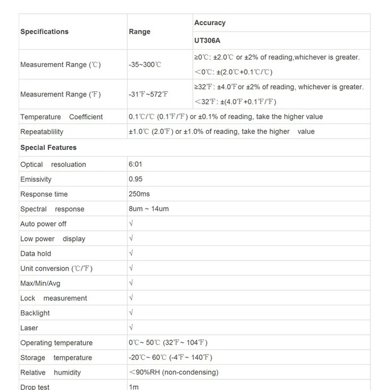 Ниже Вы можете прочитать отзывы на Карманный инфракрасный пирометр UNI-T UT306A с ЖК-дисплеем и функцией фиксации показаний и подсветкой, ознакомится с подробными характеристиками, посмотреть интересные обзоры и фотографии на Карманный инфракрасный пирометр UNI-T UT306A с ЖК-дисплеем и функцией фиксации показаний и подсветкой.