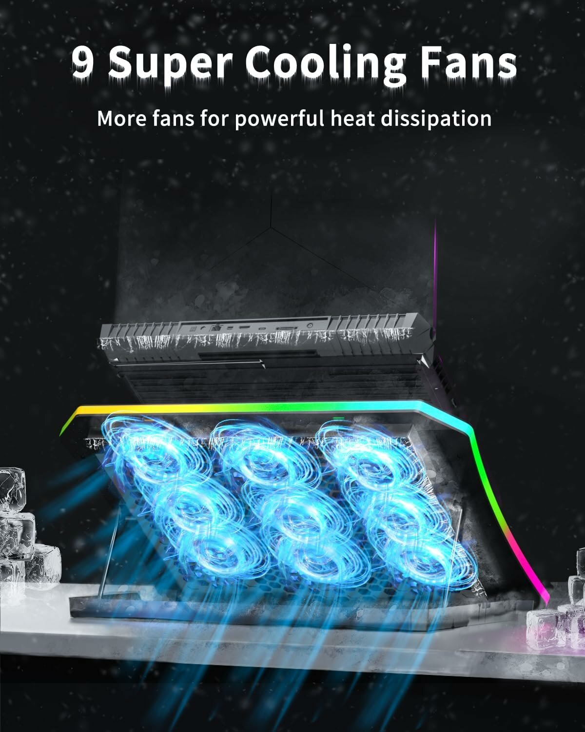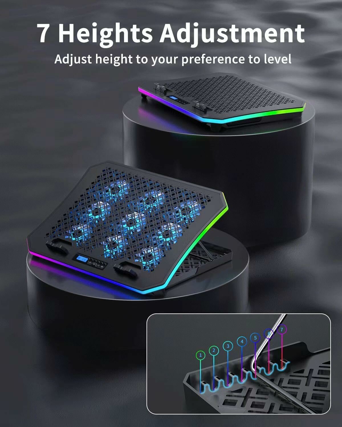 Подставка вровень с моим ноутбуком 17.3 дюйма. Клёвый дизайн, подсветка, с возможностью выбора параметров освещения. Уровень шума в пределах нормы для такой конструкции в 6 вентиляторов. Ноутбук стоит устойчиво, благодаря подпоркам, да и в целом очень гармонично. Посмотрим как покажет себя в играх, пока все устраивает вполне)