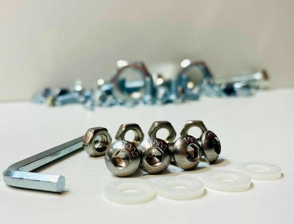 | Комплектация | Винт ISO7380 6x12 - 4 штуки Гайка шестигранная DIN934 M6 - 4 штуки Шайба полиамидная D6 - 4 штуки Ключ шестигранный Г-образный 4мм - 1 штука |