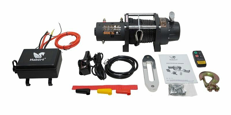 | Подробная комплектация | Лебедка электрическая Habert 6000LB синтетический трос 3,3 кВт/4,4 л.с. - 1шт. Блок управления Пульт дистанционного управления Силовые провода для монтажа Провод управления Стальные крюки Метизы Стропа Инструкция по эксплуатации Упаковка |